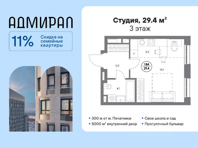 В динамично развивающемся районе Москвы, всего в 300 метрах от метро и в пешей близости от нового городского порта с протяженной набережной 13 км, свободной от автомобилей, продается студия площадью 29.40 м². без отделки. Квартира находится в корпусе жилого комплекса бизнес-класса "Адмирал", расположенного по адресу г. Москва, ул. Шоссейная, 4Д. (Застройщик - "Галс Девелопмент"). Новый амбициозный проект "Адмирал" станет частью одного из самых перспективных районов будущего - "Сити-2". В пешей доступности от современных башен Вас ждут живописные Люблинские пруды, 2 усадьбы с уникальной историей и уютный парк "Печатники" у Перервинского плёса. Район имеет отличную транспортную доступность: • 300 метров до станции метро "Печатники"; • Удобная пересадка на БКЛ и станцию МЦД-2; • 10 минут на машине до ТТК; • 15 минут до Садового кольца. Архитектура корпусов отличается динамичностью облика благодаря переменной этажности: высокие башни сочетаются с домами средней этажности. Изящным украшением становятся арочные витражи. Интеллигентный и современный стиль "Адмирала" продолжается в гранд-лобби: пастельные оттенки интерьера и фактурные элементы декора создают атмосферу безмятежного отдыха, особое ощущение простора дарят высокие потолки до 4 м и витражные окна. В домах предусмотрено от трех до шести скоростных лифтов, каждый из них спускается на любой этаж подземного паркинга и обладает удобными сенсорными панелями управления и низким уровнем шума. Благоустроенный двор площадью 5000 кв.м. украсят десятки видов гипоаллергенных растений. Здесь можно совершить приятный променад, по пути заглядывая за свежезаваренным кофе, уединиться за ноутбуком в комфортном коворкинге, занять ребенка играми в двухъярусном плейхабе или помедитировать на специальной площадке для йоги. Мягкий свет декоративных фонарей подчеркнет живописность местности, а чувство безопасности гарантируют круглосуточные системы видеонаблюдения. Дополнительные преимущества: • Высокие потолки от 2,9 до 3,25 м; • Бизнес-центр, школа и детский сад прямо на территории дома; • Подземный двухуровневый паркинг на 1955 машино-мест; • Кладовые помещения в тёплом контуре на 2м этаже; • Стрит-ритейл на первых этажах.