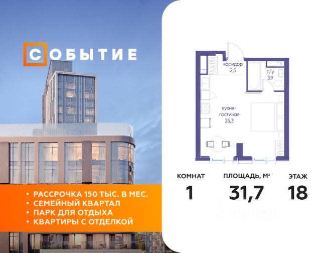 В продаже студия от застройщика. Общая площадь 33.00, жилая 16.50, кухня 8.5. Квартира расположена на 9 этаже жилого квартала "Событие-6", корпус 1, Секция 3. Квартира с чистовой отделкой. Срок сдачи: 4 кв. 2029 года. СОБЫТИЕ.6 — финальный дом парк-квартала СОБЫТИЕ на Мосфильмовской. Переезжайте в уже сформированный квартал с готовой инфраструктурой и парком! Премиальный жилой комплекс в престижном районе Москвы предлагает стильную архитектуру, продуманное благоустройство и великолепно разнообразие общественных пространств. Свой парк прямо возле дома! Архитектура Архитектура СОБЫТИЯ.6 выполнена в ультрасовременном стиле московским бюро Atrium на основе дизайн-кода британских архитекторов LDA Design и UHA London. Дом отличает оригинальная геометрия фасадов, большое остекление и высокие лобби (до 6,2 м) с авторской мебелью и светильниками. Расположение Мосфильмовская улица (Раменки) — один из престижных районов Москвы. Близость к историческому и деловому центру, природным зонам Запада столицы. Транспортная доступность: • 10 мин до Москва-Сити и ТТК; • 15 мин до Садового кольца; • 25 мин до аэропорта Внуково; • 7-10 мин до станций метро "Аминьевская" и "Мичуринский проспект". Инфраструктура: • парк "Событие" (12 га, финалист конкурса Правительства Москвы) с беговыми (1,5 км) и велодорожками (2,7 км), экотропой (1,6 км), площадками, лекторием; • школа, детский сад, магазины, салоны красоты, рестораны (к моменту заселения); • мультидвор с игровыми и спортивными площадками, мини-бульваром; • общественная терраса на 10-м этаже (коворкинг, лаунж); • Закрытые общественные пространства: детская комната, спортивный зал, коворкинг, лаунж-зоны. Паркинг 256 мест для жителей (48 — для электромобилей), 24 гостевых (5 — для электромобилей), мойки колес, кладовые, зоны для велосипедов. Окружение Парки и заповедники (Воробьёвы горы, Матвеевский лес и др.), МГУ, театр им. Н. И. Сац, стадион "Лужники". Безопасность Видеонаблюдение, контроль доступа, видеодомофоны, консьерж-сервис 24/7, системы пожарной безопасности и мультисервисная оптическая сеть. Купить квартиру-студию от застройщика в районе Раменки в Москве.