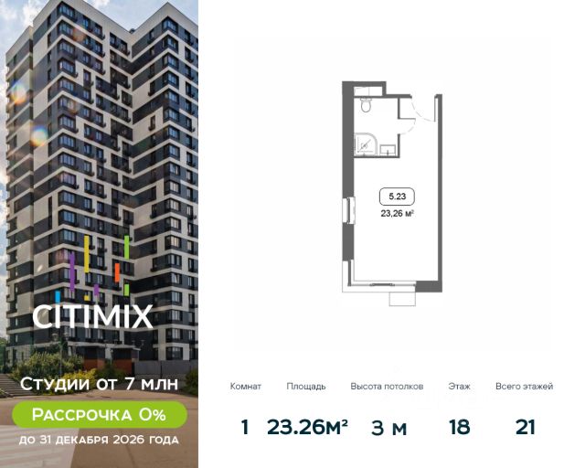 Продаётся студия в строящемся доме (Корпус 5), срок сдачи: III-кв. 2026, общей площадью 22.32 кв.м., на 18 этаже. В 2026 году запланирован перевод корпуса в жилой фонд, что позволит собственникам оформить постоянную регистрацию в Москве. МФК "CITIMIX" — студии комфорт-класса, расположенные в районе Тропарёво-Никулино в Западном административном округе Москвы. Комплекс включает в себя пять 21-этажных корпусов и собственный парк между ними. Архитектурный облик комплекса, разработанный бюро "ADM", выполнен в современном стиле, а для наружной отделки, уникальной для каждого здания, использовались керамогранитные плиты разных оттенков, витражное остекление и натуральный камень. Все студии в новостройке оснащены современным оборудованием, включая счетчики с возможностью автоматического сбора данных. Во всех подъездах спроектированы уютные лобби-зоны и индивидуальные кладовые. Наличие обширного паркинга, где могут разместиться более 650 автомобилей, позволит закрыть зеленый дворик новостройки для проезда машин и обеспечить жителям уютное, комфортное пространство для семейного отдыха. Первые этажи займут коммерческие помещения, предназначенные для социально-бытовых объектов. В 10 минутах ходьбы расположен парк Школьников, на территории которого есть Очаковские пруды и протекает река Очаковка. В пешей доступности расположен еще один зеленый массив - Тропарёвский лесопарк, занимающий площадь в 218 га. Здесь проложены дорожки для велосипедистов, роллеров и бегунов, обустроены детские площадки и зоны отдыха. Рядом с комплексом находятся детские сады, школа, медклиника, центр развития ребенка, магазины, кафе и отделения банков. Идеальный вариант для студентов, т.к. City-комплекс расположен с такими университетами, как: РАНХиГС, РУДН, РТУ МИРЭА и РНИМУ им. Н.И. Пирогова. МФК "CITIMIX" находится в 1,5 км от станции метро "Озерная" и 2,4 км от станции метро "Юго-Западная. Автомобилистам будет удобно воспользоваться выездом на МКАД (3,2 км). Застройщиком квартала выступает компания APSIS GLOBE, основанная в 2008 году. В качестве девелопера компания успешно завершила ряд инфраструктурных, коммерческих объектов на территории Московской области, Москвы, Санкт-Петербурга. Продается квартира-студия от застройщика в районе Тропарево-Никулино в Москве.