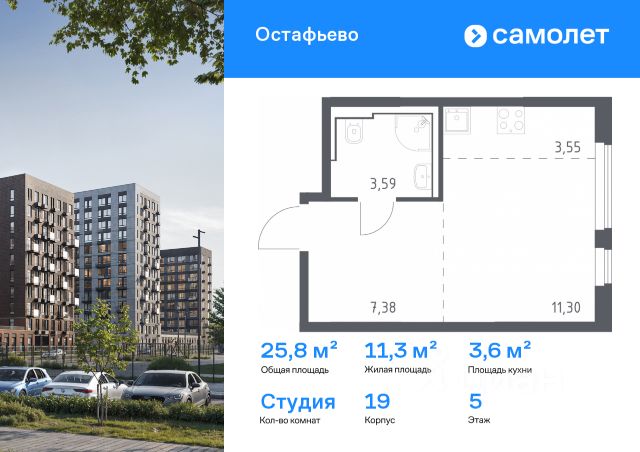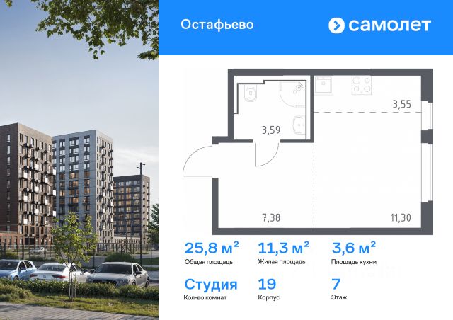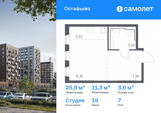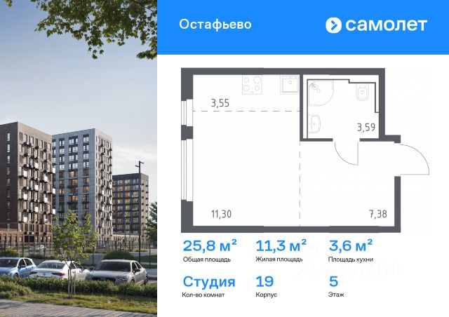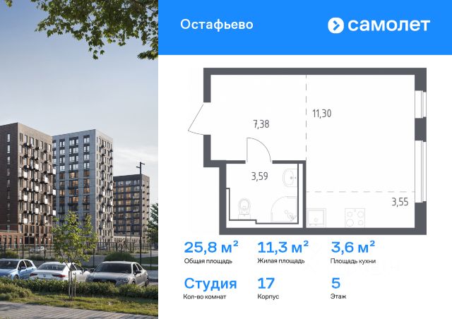 Строим кварталы для жизни с заботой о будущем. Предлагается квартира студия комфорт-класса 25,82 кв.м в корпусе 17 на 13 этаже, в ЖК "Остафьево" Квартира с предчистовой отделкой. Доступность дополнительных опций уточняйте у застройщика. Приобрести квартиру возможно по специальным акциям от застройщика, с текущими условиями акций можно ознакомиться в блоке "Акций". Цена динамическая и может отличаться, уточняйте актуальность у застройщика. "Остафьево" — масштабный жилой комплекс в Новой Москве, рядом с одноименным музеем-усадьбой и городским парком "Барыши". До станций МЦД "Щербинка" и "Остафьево" можно добраться на автомобиле за 57 минут. Часть домов уже сдана, на территории открыты две школы и три детских сада, а в будущем будет построена поликлиника, ТЦ, еще одна школа и три детских сада. Все необходимое рядом: на первых этажах домов работают магазины, аптеки и кафе. Дворы — приватные мини-парки без машин и посторонних. Кроме игровых площадок, для детей обустроили тематический плейхаб "Маяк". В будущем появятся плейхаб "Алиса в стране чудес", арт-объект "Тропа зеркал", а также большой ландшафтный парк. В квартале — монолитные дома комфортной высоты, от 10 этажей. Светлые фасады украшают кирпичные вставки в теплых природных оттенках.