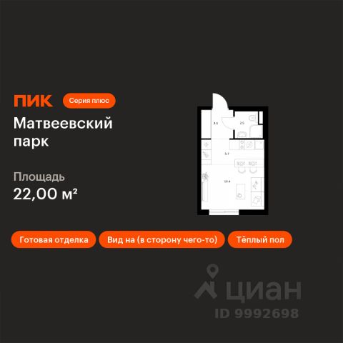 О квартире Продаётся студия общей площадью 24.6 кв.м. с отделкой white box. Квартира расположена на 12 этаже корпуса 5.2 в жилом комплексе бизнес-класса "Среда на Лобачевского" в пешей доступности от метро "Аминьевская". О жилом комплексе "Среда на Лобачевского" полностью соответствует критериям современного жилого пространства. Взяв за основу рациональный подход, мы гармонично соединили дизайн, актуальные тренды и функциональность. Продуманный современный экстерьер и функциональные планировки внутри, приватные пространства и разнообразные досуговые зоны для каждого члена семьи — все это "Среда на Лобачевского". Инфраструктура Район отлично развит и наполнен жизнью, здесь уже есть вся необходимая инфраструктура — детские сады, школы, медучреждения, торговые центры, благоустроены парки для прогулок и отдыха, удобен и легкодоступен городской транспорт. Рядом расположены учебные корпуса крупных университетов — МГУ, МГИМО и РАНХиГС. Школы и детские сады в районе занимают высокие позиции в городских рейтингах, поэтому вам не придется беспокоиться о качестве образования детей. Как и об отдыхе: поблизости расположены живописные пруды, реки и парки. Это Парк Олимпийской деревни, Парк имени 50-летия Октября, Мещерский парк и Очаковские пруды. Теперь поставить галочки в еженедельном чек-листе "спорт-прогулки-встречи с друзьями" можно, не покидая любимый район. Особенности Особое внимание в проекте уделяется созданию функциональных пространств не только внутри дома, но и за его пределами. В ландшафтном парке "Среды на Лобачевского" расположены крытые зоны для спокойного времяпровождения, места для активного отдыха и спорта, коворкинг, соседский комьюнити-центр, водные объекты. —Ландшафтный парк во дворе. —Водный сад с зонами отдыха. —Зоны коворкинга. —Дизайнерские гранд-лобби. —Бесключевой доступ. —Подземный паркинг.