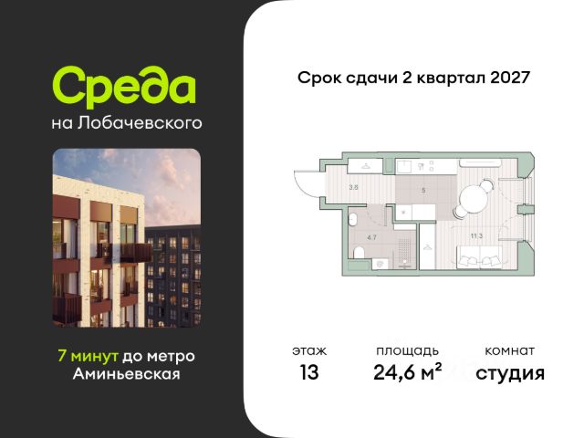 О квартире Продаётся студия общей площадью 23.50 кв. м. с отделкой на выбор: черновая, White Box. Квартира на 5 этаже корпуса 5.1 в жилом комплексе бизнес-класса "Среда на Лобачевского". До метро "Аминьевская" 7 минут пешком. Развитый район с удобным выездом "Среда на Лобачевского" строится рядом с Аминьевским и Очаковским шоссе, отсюда можно доехать до МКАД или Ленинского проспекта за 10 минут. В районе уже есть всё для жизни: рестораны, кофейни, торговые центры, поликлиники и спортивные комплексы, школы и сады, бульвары и парки. - 7 минут ходьбы до станции метро "Аминьевская". - 15 минут пешком до станции МЦД-4 "Очаково". - 8-15 минут на машине до Кутузовского проспекта и ТТК. - До 15 минут езды до заказников "Долина реки Сетунь" и "Воробьёвы горы". Акции и спецпредложения - Выгода 12%: если внести 100% оплату или оформить семейную ипотеку под 6%. Действует до 13 апреля. - Низкие ставки по ипотеке: 0,1% в первый год или 0,11% в первые два года кредита. - Трейд-ин от "Среды": можно обменять свою текущую квартиру на новую. - Ипотека для семей с детьми: если ребёнку до 7 лет, предлагаем льготную ставку 3,5% О жилом комплексе "Среда на Лобачевского" - новый квартал в парадном стиле старой Москвы. Благодаря разноэтажной застройке во дворе комплекса будет много света и воздуха, без ощущения замкнутого пространства. Во дворе лаунж-зоны для медитации и работы, площадки для игр и кинопоказов, а на первых этажах - кофейни и магазины. Особенности - Высота потолков 3,24 метра. - Панорамное остекление в пол. - Квартиры с террасами, мастер-спальнями и сквозными планировками. - Дизайнерские гранд-лобби в каждом корпусе. - Ландшафтный парк с зонами отдыха у воды. - Коворкинг на свежем воздухе. - Локации для спорта, игр и приватного отдыха. - Соседский бульвар с площадкой для подростков. - Подземный паркинг с двумя въездами. - Система бесключевого доступа. - Стрит-ритейл на первых этажах.