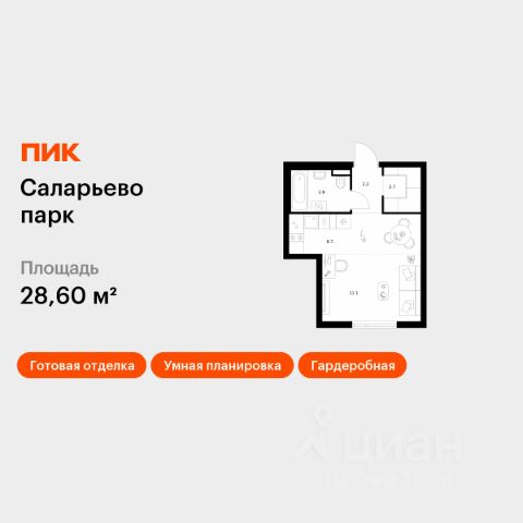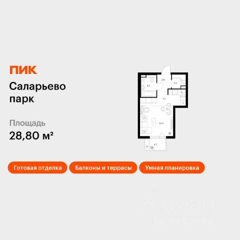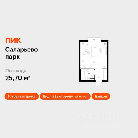 Продаётся квартира-студия площадью 25,4 кв.м на 8 этаже 16 этажного дома (Корпус 74.7, Секция 7) проекта ПИК Саларьево парк. Светлый просторный подъезд на уровне земли, функциональная планировка, большие окна, c отделкой. Жилой район "Саларьево парк" расположен в Новой Москве, в четырёх километрах от МКАД по Киевскому шоссе. Две станции метро: "Саларьево" и "Филатов луг", — находятся в пешей доступности от проекта. Дойти до них можно за 510 минут. В квартале уже создана качественная среда, где есть абсолютно всё для полноценной жизни, работы и отдыха. Благодаря удобному расположению проекта всё важное будет рядом: детские сады, школы, кафе и рестораны, шопинг в торговых центрах, фитнес и даже аэропорт. Все корпуса в квартале гармонично сочетаются, образуя единую городскую среду. Между собой их объединяет невысокая этажность и натуральная цветовая гамма. Здесь приятно гулять и проводить время на улице всей семьёй. В "Саларьево парке" создана уникальная образовательная среда, включающая в себя шесть школ, рассчитанных на 6 250 учеников. Две из них уже открыты, их посещает 2 300 детей. Также на территории "Саларьево парка" находится 12 детских садов, один из которых с бассейном. Сейчас уже открыты 7 садов. В "Саларьево парке" открыта уникальная игровая площадка — PlayHub "Оригами". Здесь есть ручей, горка-труба и рельефные холмы. Взрослые смогут отдохнуть в уютном кафе, пока дети играют. Также на территории проекта есть SportHub — большая спортивная зона, разделённая по интересам и возрастам. Здесь можно заниматься разными видами спорта: футболом, баскетболом, волейболом и стритболом. Зимой центральную часть площадки превращают в каток. Во дворах-парках жилого квартала есть места для отдыха, детские и спортивные площадки. На первых этажах домов расположены магазины, кафе и полезные сервисы. Также вблизи проекта есть несколько масштабных торговых центров. До ТЦ "Саларис" пять минут пешком, до "Рио", Metro Cash & Carry и "Леруа Мерлен" — пять минут на автомобиле. Артикул 1007059 (Застройщик ООО "Специализированный Застройщик "Тирон")