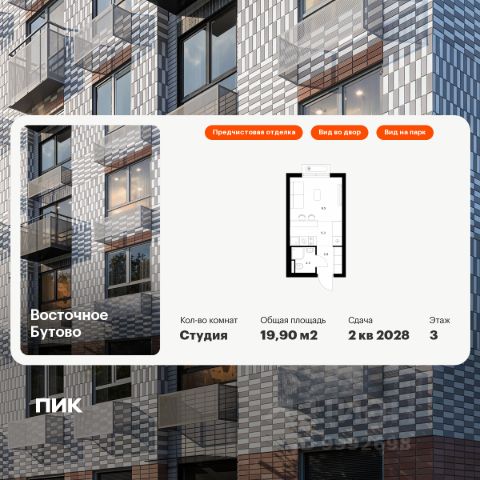 Продается студия в жилом комплексе комфорт класса "Домодедово парк" площадью 28.12 кв.м. на 12 этаже 17 этажного дома. Окна выходят во двор и на улицу.