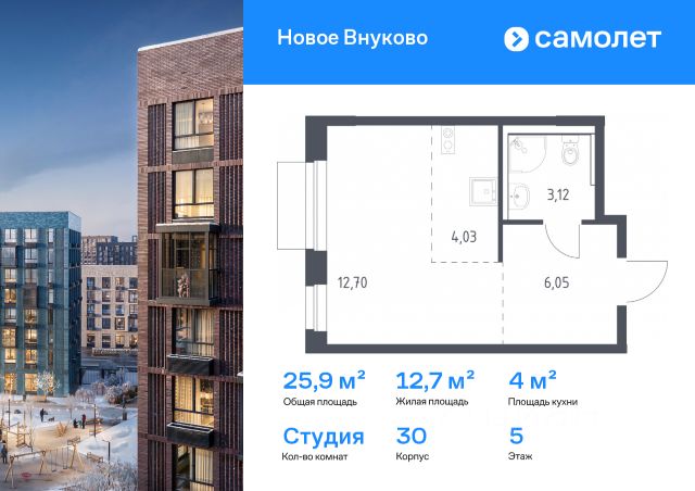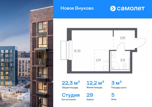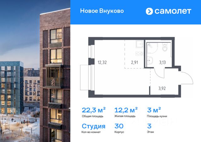 Строим кварталы для жизни с заботой о будущем. Предлагается квартира студия комфорт-класса 22,28 кв.м в корпусе 30 на 3 этаже, в ЖК "Новое Внуково" Квартира без отделки. Доступность опции "отделка" и возможность комплектации мебелью и декором уточняйте у застройщика. Приобрести квартиру возможно по специальным акциям от застройщика, с текущими условиями акций можно ознакомиться в блоке "Акций". Цена динамическая и может отличаться, уточняйте актуальность у застройщика. "Новое Внуково" — это жилой комплекс в Новой Москве, у подножия берега реки Незнайка. Поблизости — живописные места для прогулок: народный парк "Ручеек", усадьба Старо-Никольское, Валуевский и Ульяновский лесопарки. Часть домов сдана и внутри района уже открыт детсад с бассейном, а в ближайшее время откроются еще 3 детсада, 2 школы и поликлиника. На территории проекта будет построен первый в России Центр Российской Федерации Баскетбола, где будут площадки с трибунами, тренажерный зал, кафе и конференц-зал. Дворы-парки закрыты от машин и посторонних. На территории — прогулочный маршрут вдоль реки Незнайка и набережная с шезлонгами и качелями для отдыха. Также здесь появится плейхаб "Незнайка на Луне", площадь для мероприятий с сухим фонтаном, летним кинотеатром и кафе. В жилом комплексе — монолитные дома высотой от 6 до 14 этажей. Фасады облицованы кирпичом природных оттенков.