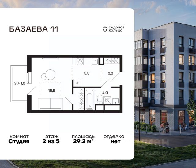 Продается квартира в ЖК "Базаева, 11" студия на 2 этаже 5 этажного дома. Общая площадь: 29.2 кв.м. Высота потолков 2.72 м. Срок сдачи 2 квартал 2027 г. Эскроу-счет. Застройщик ГК "Садовое кольцо". -Расположение Жилой комплекс в экологически чистом районе Московской области городском округе Шаховская. Камерное пятиэтажное здание находится в пешей доступности от всей необходимой инфраструктуры. Автостанция Шаховская расположена в 10 минутах от дома. Всего в 11 минутах ходьбы находится ж/д станция Шаховская, откуда удобно добраться электричкой до Рижского вокзала. Дорога до МКАД займет 1,5 часа на автомобиле. -Инфраструктура Проект расположен рядом с современным теннисным центром и Дворцом торжеств. В шаговой доступности — детская школа искусств, Шаховская гимназия, школа 1 и три детских сада. Всего за 3 минуты от дома можно дойти до Городского парка — здесь вас ждут аттракционы, верёвочный городок, тюбинговая горка и ресторан. Парк соседствует с живописным сквером у реки, украшенным подвесными мостами, ротондой и фонтанами. -Внутренний двор На территории проекта появится огороженная детская площадка, рассчитанная на детей всех возрастов, — с песочницей, канатным комплексом и зоной для игр. Для любителей активного образа жизни будет обустроена спортивная площадка с теннисным столом, турниками, тренажёрами и гимнастическими брусьями. Для автовладельцев на территории проекта предусмотрена удобная плоскостная парковка на 81 машино-место. -Архитектура Монохромное здание оформлено декоративным кирпичом и штукатуркой в тёплых светло-серых и насыщенных серых тонах. Эстетику фасада подчёркивают террасные ограждения и корзины для кондиционеров, выдержанные в единой цветовой гамме. -Входная группа Входные группы спроектированы на уровне земли — без ступеней и перепадов. Такой подход обеспечивает комфортный доступ в подъезд с коляской, чемоданом или велосипедом и подчеркивает продуманную архитектуру дома.
