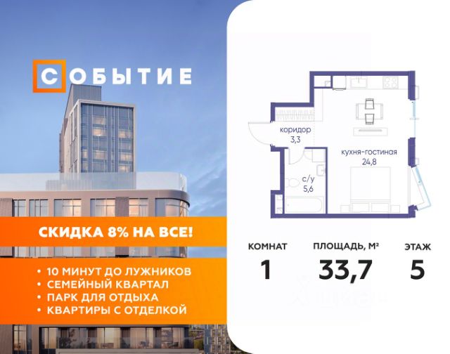 1 день до окончания акции "Скидка 8%" Весь март - скидка до 8% действует до 31.03.2026 г. при 100% оплате и не субсидированной ипотеке! В продаже студия от застройщика. Общая площадь 34.40, жилая 19.30, кухня 6.2. Квартира расположена на 3 этаже жилого квартала "Событие-6", корпус 2, Секция 2. Квартира без отделки. Срок сдачи: 4 кв. 2029 года. СОБЫТИЕ.6 — финальный дом парк-квартала СОБЫТИЕ на Мосфильмовской. Переезжайте в уже сформированный квартал с готовой инфраструктурой и парком! Премиальный жилой комплекс в престижном районе Москвы предлагает стильную архитектуру, продуманное благоустройство и великолепно разнообразие общественных пространств. Свой парк прямо возле дома! Архитектура Архитектура СОБЫТИЯ.6 выполнена в ультрасовременном стиле московским бюро Atrium на основе дизайн-кода британских архитекторов LDA Design и UHA London. Дом отличает оригинальная геометрия фасадов, большое остекление и высокие лобби (до 6,2 м) с авторской мебелью и светильниками. Расположение Мосфильмовская улица (Раменки) — один из престижных районов Москвы. Близость к историческому и деловому центру, природным зонам Запада столицы. Транспортная доступность: • 10 мин до Москва-Сити и ТТК; • 15 мин до Садового кольца; • 25 мин до аэропорта Внуково; • 7-10 мин до станций метро "Аминьевская" и "Мичуринский проспект". Инфраструктура: • парк "Событие" (12 га, финалист конкурса Правительства Москвы) с беговыми (1,5 км) и велодорожками (2,7 км), экотропой (1,6 км), площадками, лекторием; • школа, детский сад, магазины, салоны красоты, рестораны (к моменту заселения); • мультидвор с игровыми и спортивными площадками, мини-бульваром; • общественная терраса на 10-м этаже (коворкинг, лаунж); • Закрытые общественные пространства: детская комната, спортивный зал, коворкинг, лаунж-зоны. Паркинг 256 мест для жителей (48 — для электромобилей), 24 гостевых (5 — для электромобилей), мойки колес, кладовые, зоны для велосипедов. Окружение Парки и заповедники (Воробьёвы горы, Матвеевский лес и др.), МГУ, театр им. Н. И. Сац, стадион "Лужники". Безопасность Видеонаблюдение, контроль доступа, видеодомофоны, консьерж-сервис 24/7, системы пожарной безопасности и мультисервисная оптическая сеть.