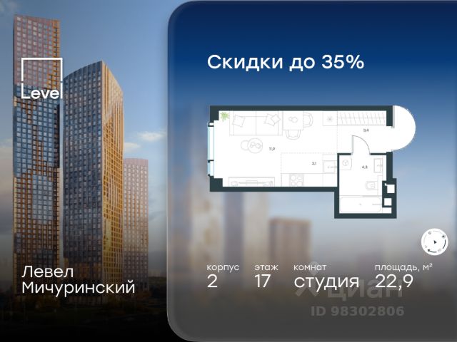 Продаётся квартира-студия от застройщика: общая площадь 34.40 м², жилая 20.70 м², кухня 5.00 м², 3-й этаж, жилой квартал "Событие-6", корпус 2 (секция 2) Срок сдачи: 1 квартал 2029 года. Позвоните сейчас и забронируйте квартиру! Продуманный до деталей. Созданный для жизни, полной счастливых событий. Парк-квартал СОБЫТИЕ - это жизнь класса премиум в престижном районе на Мосфильмовской улице. Архитектура мирового уровня. Выигрышное расположение на границе природного комплекса "Долина реки Раменки". Все для комфортной жизни и досуга: от детсадов и школ до ресторанов и медцентров. И новая точка притяжения - уже готовый парк "Событие" с пространствами активности для всех возрастов и интересов. Особенности квартала: • "Парящие" мосты и парк под облаками - уникальный дом с самыми завораживающими видами из окон "в пол" • Собственный парк - сразу за порогом! • Архитектурная концепция от известных международных бюро LDA Design и UHA London • Инфраструктура "тапочной доступности": в кафе, школу, магазин - за пару минут! • Внутренний двор - настоящее продолжение вашего дома: закрытая охраняемая территория без машин, развивающие детские площадки, воркауты-зоны для тех, кто хочет быть в форме, площади для праздников и посиделок с соседями.