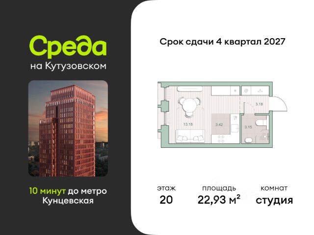 О квартире Продаётся студия общей площадью 25.12 кв. м. с отделкой на выбор: черновая, White Box. Квартира на 13 этаже корпуса 5 в жилом комплексе бизнес-класса "Среда на Кутузовском". До метро "Кунцевская" 10 минут пешком. Исторический зелёный район "Среда на Кутузовском" строится в Кунцево - историческом и экологически чистом районе Москвы. Здесь нет крупных производств, много лесных массивов и роза ветров, которая обеспечивает приток чистого воздуха. Район наполнен жизнью и уже развит: много детских садов и школ, поликлиники, магазины, кафе, спортивные объекты, парки. - 10 минут пешком до станции метро "Кунцевская". - 5-8 минут на машине до Кутузовского проспекта и Можайского шоссе и 10-15 минут до Рублёвского и МКАД. - 15 минут езды до Крылатских холмов, Суворовского парка и заказника "Долина реки Сетунь". Акции и спецпредложения - Выгода 12%: если внести 100% оплату или оформить семейную ипотеку под 6%. Действует до 13 апреля. - Низкие ставки по ипотеке: 0,1% в первый год или 0,11% в первые два года кредита. - Трейд-ин от "Среды": можно обменять свою текущую квартиру на новую. - Ипотека для семей с детьми: если ребёнку до 7 лет, предлагаем льготную ставку 3,5% О жилом комплексе "Среда на Кутузовском" - новый квартал с башнями от 12 до 44 этажей, окружённый лесными массивами и историческими усадьбами старой Москвы. Во внутреннем дворе есть водоём, многоуровневые зоны с детскими и спортивными площадками, коворкинг на свежем воздухе и локации для уединённого отдыха. Особенности - Архитектура с многослойными фасадами. - Квартиры с террасами и мастер-спальнями. - Окна в пол на всех этажах. - Общественные лаунж-гостиные. - Собственный ландшафтный парк во дворе. - Зоны барбекю и площадки для отдыха у воды. - Умный подземный паркинг. - Стрит-ритейл на первых этажах.