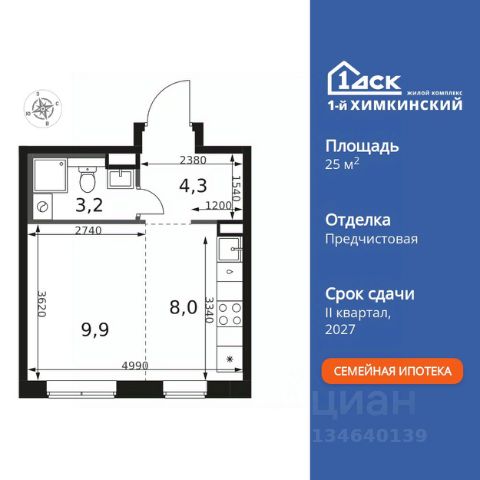 БЕЗ ПЕРВОНАЧАЛЬНОГО ВЗНОСА! Прямая продажа от застройщика! Жилой Комплекс класса Комфорт. Продаётся квартира-студия номер 10 общей площадью 25.4 кв.м. на 2-м этаже 17 этажного здания. Предчистовая отделка. Особенности квартиры: - Организуем показ в удобное для вас время! - Линейная планировка - максимальная функциональность и удобство. - Увеличенное количество окон - дополнительное освещение и свежий воздух. - Линейная кухня - функциональность и практичность в одном решении. - Ниша под шкаф - компактное и удобное место для вещей. Квартира с предчистовой отделкой. Вам не придется заниматься черновыми и трудоёмкими работы, а чистовую отделку и дизайн - сделайте на свой вкус. Информация о комплексе: "1-й Химкинский": гармония современного города и природы на 102 га у Химкинского леса и канала им. Москвы. Развитая инфраструктура: ТЦ, школы, спорткомплекс с термами и СПА, парк развлечений. Идеальный баланс для жизни в окружении зелени и городского комфорта. Транспортная доступность: ЖК "1-й Химкинский" дает возможность выбрать любой способ передвижения как до города, так и до самых разных объектов, которые могут представлять интерес для его жителей. Не важно, какой способ передвижения вы предпочитаете, успевать всегда и везде можно вне зависимости от выбора транспорта. - 8 мин. пешком (800 м) до остановки "Золотая Арка" -10 мин пешком (1 км) до остановки "Поворот на Ивакино" Внутренняя инфраструктура: Безопасность: закрытые дворы без машин, безбарьерная среда, сквозные подъезды, камеры на детских площадках с трансляцией на смартфон. Отдых: семейный парк развлечений, двухэтажный ТЦ 8 000 м² с фудкортом. Образование: 4 детских сада, 2 муниципальные школы. Спорт: закольцованный веломаршрут, спорткомплекс с термами, тренажерный зал, воркаут зоны. Инфраструктура: поликлиника со станцией скорой помощи, пожарное депо. Паркинг: подземный паркинг, кладовые на -1 этаже, СТО и автомойка на территории. Квартира с предчистовой отделкой - ваш дизайн без черновых работ