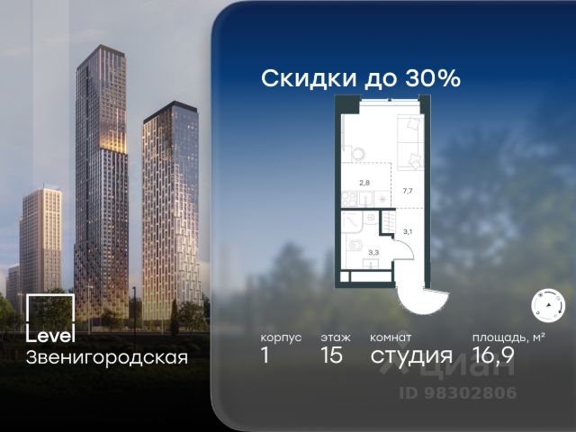 Цена указана с учётом скидки при 100%-й оплате, несубсидированной ипотеке, рассрочке (кроме программы "Рассрочка 0%"). В жилом квартале продаётся студия площадью 17.40 кв.м white box. Квартира расположена на 6 этаже 48 этажного корпуса 1 в жилом комплексе комфорт класса Level Звенигородская (компания Level Group/Левел групп). Отличная транспортная доступность - 5 мин. пешком до метро "Звенигородская" (откроется к окончанию строительства); - 18 мин. пешком до станции МЦК "Хорошёво" и станции БКЛ "Народное ополчение"; - 4 мин. на авто до ТТК; - 8 мин. на авто до Садового кольца; - 15 мин. на авто до Кремля. Продуманный архитектурный проект - Концепция от студии Станислава Михаловского, в основу которой легло единение природы и города; - Двухкамерные стеклопакеты в окнах, алюминиевый и ПВХ профиль - в квартирах тепло зимой и прохладно летом; - С верхних этажей откроются панорамные виды на город, Москву-реку, "Москва-Сити" и Москворецкий парк; - Лобби со всеми удобствами: окна в пол, высокие потолки до 4,7 м, лаунж-зоны, колясочные, гостевые санузлы и мойки для лап животных; - Централизованные водонагреватели гарантируют круглогодичную подачу горячей воды в каждую квартиру. Благоустройство Концепция благоустройства разработана совместно с бюро UNK landscape. Высота башен приближается к 200 метрам - они словно касаются неба. Небесный простор проецируется на территорию двора с помощью подсветки, визуально увеличивая пространство и отражаясь в авторских элементах архитектуры. На территории площадью 0,45 га расположатся: - "Облако событий" - место встреч и общения; - "Облако спорта" - всё для поддержания себя в форме; - "Облако принятия решений" - пространство для работы на свежем воздухе; - "Облако спокойствия" - для отдыха в тишине природы; - "Облако игр" - площадки для подростков и самых маленьких. Инфраструктура В жилом комплексе откроется 21 коммерческое помещение: продуктовые лавки, кафе, салоны красоты, службы доставки и творческие студии. Этап 1 включает строительство двухуровневого подземного паркинга. Всего здесь расположится 351 машино-место, включая семейные места, и 264 кладовых помещения. В распоряжении жителей развитая инфраструктура района: 15 супермаркетов, 5 спортивных объектов, 9 медучреждений, 7 детских садов, 4 школы, 3 благоустроенных парка - всё в шаговой доступности. Инженерия Комфортное перемещение внутри домов будут обеспечивать надёжные лифты с доступом в паркинг с жилых этажей. В каждом корпусе предусмотрено до шести кабин, включая сервисные лифты. Попасть на территорию комплекса можно только по единому ключу доступа. Видеонаблюдение установлено на входах в подъезды, в лобби, в общих зонах, на въезде в паркинг. Гости смогут связаться с жителями дома через входные видеопанели, а управлять доступом на территорию можно через видеодомофон или приложение на телефоне.