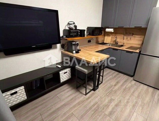 На стенах поклеены обои под покраску, на полу постелен ламинат с плинтусами и откосами. Есть вытяжная вентиляция в санузле и на кухне, выходы хв/гв, место под раковину на кухне. Кроме того, в помещениях уже есть выключатели освещения, розетки для бытовой техники и роутера, а также сделаны закладные для оптоволокна для интернета.