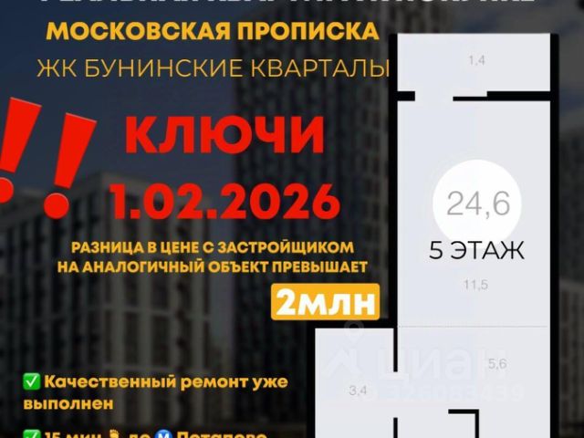 В жилом комплексе, расположенном по соседству с ландшафтным парком "Южное Бутово", продается 1-комнатная квартира площадью 34.80 кв. м. с отделкой. Квартира расположена на 23 этаже 2 корпуса в жилом квартале комфорт-класса "Новые Смыслы" (ГК Unikey/Юникей). Доступная и удобная локация: - 10 минут ходьбы до станции метро "Потапово". - 25 минут ходьбы до станции метро "Бунинская аллея". - 15 минут на авто до Калужского шоссе. - 20 минут на авто до МКАД. - 30 минут на машине до аэропортов "Внуково" и "Остафьево". Продуманный архитектурный проект: - Разноуровневые секции с эстетичные башнями и контрастными цветовыми сочетаниями, напоминающими башни в Сити. - Сказочные виды из окон на современный район столицы. - Авторские планировки с потолками в 3 метра, просторными кухнями-гостиными и мастер-спальнями. - Комфортные бесплатные общественные пространства. - Подземный паркинг с прямым доступом на лифте. - Настоящий лес с живописными пейзажами и прудом прямо во дворе. Расположение Комплекс "Новые Смыслы" расположится в благоприятном районе Новой Москвы - Коммунарка. Зеленое окружение, богатая инфраструктура развивающегося района - все это сформирует особое пространство для комфортной жизни, наполненной смыслом. 10 минут на велосипеде - и вы в ландшафтном парке "Южное Бутово" или сквере у Потаповских прудов. Чуть дальше расположен Бутовский лесопарк. В окружении "Новых Смыслов" вы найдете все необходимые социальные объекты. В двух шагах от дома находится 5 школ, более десятка детских садов, секции для занятий малышей и подростков, частные клиники, супермаркеты, рестораны, студии красоты и фитнес-центры. За 12 минут на авто вы доберетесь до ледовой арены, комплекса "Спорт Станция" и спа-центра "Termoland". Внутренняя инфраструктура Для жителей "Новых Смыслов" будут созданы бесплатные общественные пространства: - Деловая гостиная с эстетичным коворкингом и переговорными. - Гостиная для души и тела, включающая фитнес-зону с тренажерами и пространства для стретчинга, йоги и медитаций. - Гостиная детства, где дети будут играть и развиваться под присмотром тьютора. - Кино-гостиная - кинотеатр на крыше одного из домов, предлагающий разнообразную программу. - Прачечная, работающая только для жильцов. Вместе с корпусами комплекса на территории запланировано строительство детского сада. На первых этажах корпусов откроются кофейни, пекарни, сервисы быта и пункты доставки. Благоустройство Чтобы отдохнуть от суеты города, достаточно выйти во двор: здесь раскинулся настоящий лес с живописными пейзажами. В тени деревьев жителей ждут пруд с мостиком и беседкой на берегу, тихие прогулочные аллеи, спортивная площадка и зоны для занятий йогой и бадминтоном на свежем воздухе. Юных жителей порадуют современные детские площадки, жукарий и специальное пространство для подвижных игр. Безопасность на территории гарантирована: двор огорожен от машин и оснащен камерами видеонаблюдения.