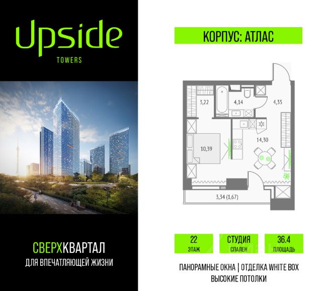 Продаётся студия площадью 27.4 кв.м на 20 этаже 55 этажного корпуса Эльбрус в квартале небоскребов "Upside Towers". В квартире отделка White-box, c видом на детский сад, БЦ Останкино. Номер квартиры А2002. Upside Towers - технологичный квартал строится в динамично развивающемся Бутырском районе, в 3 мин. от метро, в 5 мин. от ТТК. На территории 7 га возводится 5 высотных башен от 19 до 58 этажей, названных в честь главных вершин земли. Квартиры с панорамными окнами в пол, высокими потолками и современными инженерными решениями. Благоустроенная зеленая территория включает: приватные дворы, природный комплекс, прогулочный бульвар, ландшафтный парк 2,5 га с сенсорным садом и многофункциональными игровыми и спортивными площадками. Большое внимание в проекте уделяется созданию социальной инфраструктуры. Более 2000 кв.м. отдано под Upside club закрытый клуб, уникальное пространство для общения и развития жителей квартала, включая SKY SPA Relax на 47 этаже башни "Атлас" расслабляющей атмосферой, джакузи, сауной, залами для релаксации и йоги доступное жителям Upside Towers, всесезонное барбекю-патио, лаундж зону с камином и роялем, многофункциональные игровые пространства, домашний кинотеатр, коворкинг и переговорные. В башнях откроются смотровые террасы для резидентов с панорамными видами на город, парки, Останкинскую башню, ВДНХ, Ботанический сад и Москву-Сити. В рамках проекта строится государственная школа и детский сад, разместится более 15 000 кв.м. коммерческой инфраструктуры. Насыщенная социальная инфраструктура формирует множество сценариев для жизни на территории квартала. В Upside Towers применяются лучшие технологии и практики, чтобы обеспечить высшее качество жизни: Воздух, не уступающий по качеству горному, обеспечит приточно-вытяжная вентиляция. Пятиступенчатая очистка воды с сохранением полезных минералов. Центральное кондиционирование. Внутрипольные конвекторы с естественной конвекцией. Современные системы безопасности и мониторинга микроклимата. Высокоскоростной интернет на всей территории, в квартирах и паркинге за счет усиления GSM-связи всех ведущих операторов. Все места в подземном паркинге оборудованы зарядками для электрокаров. Бутырский район непрерывно развивается и готовится стать новым современным деловым районом Москвы. В рамках программы "Индустриальные кварталы" комплексного развития территории Огородного проезда будут построены современные образовательные и спортивные учреждения, торговые центры, кафе, банки, общественно-деловые здания и другие объекты. В пешей доступности работают школы, детские сады, поликлиники, аптеки, супермаркеты и многое другое. Рядом находится несколько крупных зелёных зон для спокойного отдыха: Парк Останкино, ВДНХ, Парк Сокольники, Гончаровский парк, в 15 минутах пешком располагаются знаменитые арт-пространства - дизайн-завод Flacon и "Хлебозавод". Время в пути на автомобиле до центра Москвы 15 минут. (Застройщик ООО "СЗ "К-Девелопмент")