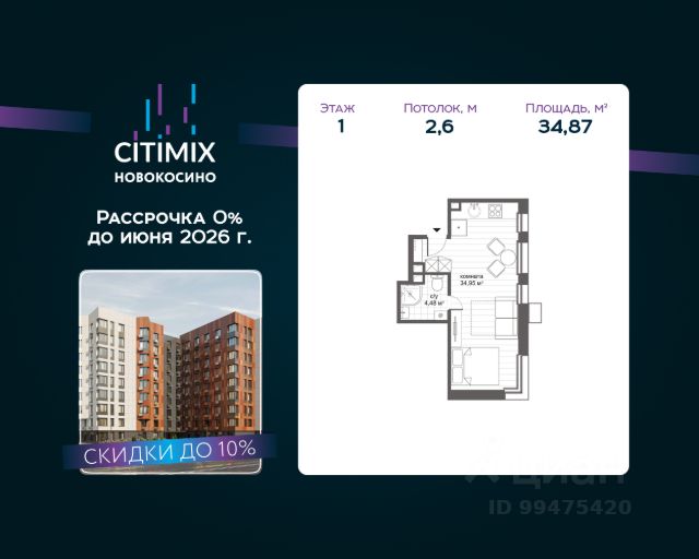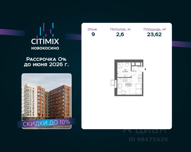 Продается студия 27.82 кв.м. в жилом комплексе EVO на 16 этаже по адресу: Московская область, г. Реутов, ул. Комсомольская. EVO - проект комфорт-класса от девелопера Dogma. Каждый житель сможет открыть для себя максимум возможностей. Совершенствоваться во всех направлениях: физическом, эмоциональном и материальном. В EVO можно открыть для себя новые виды спорта, найти единомышленников по хобби, партнеров по бизнесу, развивать в детях новые грани, наслаждаться природой и лаконичной архитектурой. Безопасность - Закрытая территория - Круглосуточное видеонаблюдение - Контроль доступа Расположение Пешком - 7 минут до станции Реутов - 20 минут до метро Новокосино На машине - 4 минуты до МКАД - 6 минут до шоссе Энтузиастов - 9 минут до Носовихинское шоссе - 13 минут до МСД (Московский скоростной диаметр) Более 6 га благоустройства в первой очереди - Зеленый двор без машин, кленовая аллея для прогулок - Нейродинамические площадки для детей разных возрастов - Workout зона, столы для пинг-понга, места для занятия йогой. велодорожки и дорожки для скандинавской ходьбы - Детский сад на 180 мест и школа на 750 мест - Кроссбукинг - Лобби с зоной ожидания, колясочной и лапомойкой - Магазины и кафе на первых этажах Окружение - Реутовский центральный парк, Александровский сквер, Фабричный пруд - ТЦ "Экватор", ТК "Шоколад" - Спортивный комплекс "Старт", Ледовый комплекс "Реутов Арена" - Музей-усадьба "Кусково" Социальная инфраструктура В первой очереди предусмотрено строительство детского сада на 180 мест и школы на 750 учащихся. В 10 минутах ходьбы от EVO находится детский технопарк "Изобретариум", в котором более 60 научных секции: от IT до промышленного дизайна. Для творческих ребят рядом есть художественная и музыкальные школы, хоровая студия. Квартиры-студии с евроремонтом рядом с метро Новокосино.