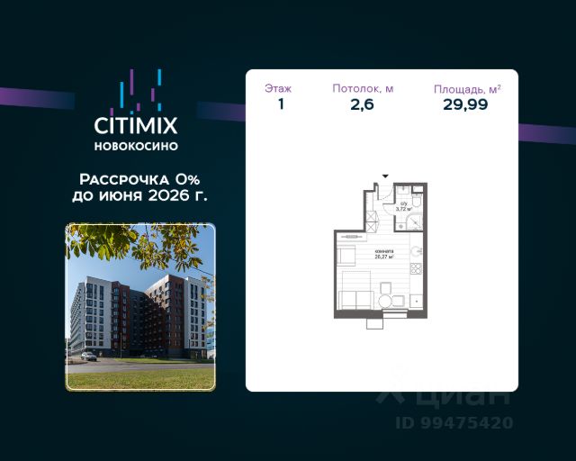 Продается студия 27.94 кв.м. в жилом комплексе EVO на 2 этаже по адресу: Московская область, г. Реутов, ул. Комсомольская. Скидка 10% на пул квартир!* EVO - проект комфорт-класса от девелопера Dogma. Каждый житель сможет открыть для себя максимум возможностей. Совершенствоваться во всех направлениях: физическом, эмоциональном и материальном. В EVO можно открыть для себя новые виды спорта, найти единомышленников по хобби, партнеров по бизнесу, развивать в детях новые грани, наслаждаться природой и лаконичной архитектурой. Более 6 га благоустройства в первой очереди! - Зеленый двор без машин, кленовая аллея для прогулок. - Нейродинамические площадки для детей разных возрастов. - Workout зона, столы для пинг-понга, места для занятия йогой. велодорожки и дорожки для скандинавской ходьбы. - Детский сад на 180 мест и школа на 750 мест. - Кроссбукинг. - Лобби с зоной ожидания, колясочной и лапомойкой. - Магазины и кафе на первых этажах. БЕЗОПАСНОСТЬ - Закрытая территория. - Круглосуточное видеонаблюдение. - Контроль доступа. РАСПОЛОЖЕНИЕ Пешком - 7 минут до станции Реутов. - 20 минут до метро Новокосино. На машине - 4 минуты до МКАД. - 6 минут до шоссе Энтузиастов. - 9 минут до Носовихинское шоссе. - 13 минут до МСД (Московский скоростной диаметр). СОЦИАЛЬНАЯ ИНФРАСТРУКТУРА В первой очереди предусмотрено строительство детского сада на 180 мест и школы на 750 учащихся. В 10 минутах ходьбы от EVO находится детский технопарк "Изобретариум", в котором более 60 научных секции: от IT до промышленного дизайна. Для творческих ребят рядом есть художественная и музыкальные школы, хоровая студия. ОКРУЖЕНИЕ - Реутовский центральный парк, Александровский сквер, Фабричный пруд. - ТЦ "Экватор", ТК "Шоколад". - Спортивный комплекс "Старт", Ледовый комплекс "Реутов Арена". - Музей-усадьба "Кусково". *Скидка 10% на выделенный пул квартир действительна при покупке в ипотеку. Квартиры-студии с евроремонтом рядом с метро Новокосино.