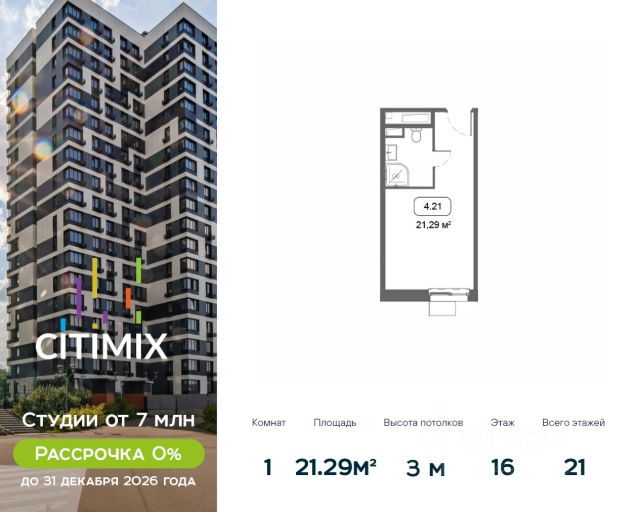 Продаётся студия в строящемся доме (Корпус 4), срок сдачи: III-кв. 2026, общей площадью 21.29 кв.м., на 16 этаже. В 2026 году запланирован перевод корпуса в жилой фонд, что позволит собственникам оформить постоянную регистрацию в Москве. МФК "CITIMIX" — студии комфорт-класса, расположенные в районе Тропарёво-Никулино в Западном административном округе Москвы. Комплекс включает в себя пять 21-этажных корпусов и собственный парк между ними. Архитектурный облик комплекса, разработанный бюро "ADM", выполнен в современном стиле, а для наружной отделки, уникальной для каждого здания, использовались керамогранитные плиты разных оттенков, витражное остекление и натуральный камень. Все студии в новостройке оснащены современным оборудованием, включая счетчики с возможностью автоматического сбора данных. Во всех подъездах спроектированы уютные лобби-зоны и индивидуальные кладовые. Наличие обширного паркинга, где могут разместиться более 650 автомобилей, позволит закрыть зеленый дворик новостройки для проезда машин и обеспечить жителям уютное, комфортное пространство для семейного отдыха. Первые этажи займут коммерческие помещения, предназначенные для социально-бытовых объектов. В 10 минутах ходьбы расположен парк Школьников, на территории которого есть Очаковские пруды и протекает река Очаковка. В пешей доступности расположен еще один зеленый массив - Тропарёвский лесопарк, занимающий площадь в 218 га. Здесь проложены дорожки для велосипедистов, роллеров и бегунов, обустроены детские площадки и зоны отдыха. Рядом с комплексом находятся детские сады, школа, медклиника, центр развития ребенка, магазины, кафе и отделения банков. Идеальный вариант для студентов, т.к. City-комплекс расположен с такими университетами, как: РАНХиГС, РУДН, РТУ МИРЭА и РНИМУ им. Н.И. Пирогова. МФК "CITIMIX" находится в 1,5 км от станции метро "Озерная" и 2,4 км от станции метро "Юго-Западная. Автомобилистам будет удобно воспользоваться выездом на МКАД (3,2 км). Застройщиком квартала выступает компания APSIS GLOBE, основанная в 2008 году. В качестве девелопера компания успешно завершила ряд инфраструктурных, коммерческих объектов на территории Московской области, Москвы, Санкт-Петербурга. Продам квартиру-студию с евроремонтом рядом с метро Юго-Западная.