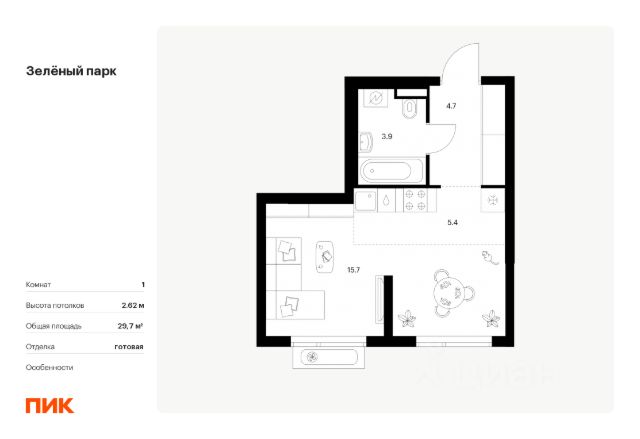 Продаётся квартира-студия площадью 28,9 кв.м на 4 этаже 13 этажного дома (Корпус 5.3, Секция 3) проекта ПИК Зелёный парк. Светлый просторный подъезд на уровне земли, функциональная планировка, большие окна, c отделкой. Большой квартал с оригинальной архитектурой в обжитом районе Зеленограда. От него до станции МЦД-3 "Зеленоград-Крюково" — 20 минут пешком, до Кутузовского шоссе можно доехать на машине за 3 минуты, а до Пятницкого шоссе — за 5 минут. Характер "Зелёного парка" отражён в архитектуре. Квартал состоит из уютных разноэтажных блоков с оригинальными акцентами. Цветовая палитра проекта спокойная и сдержанная: оттенки белого и коричневого сочетаются с пастельным розовым и мятным. В проекте запланированы также два детских сада, две школы и паркинг. На первых этажах откроются магазины, кафе и другие сервисы — чтобы купить кофе и свежий хлеб к завтраку, можно будет просто спуститься на лифте. В уютных дворах-парках появятся места для отдыха, детские площадки, кофейни и зоны отдыха. Рядом — Зеленоградский лес, Парк Победы и Михайловский пруд, где можно гулять и заниматься спортом. У жителей "Зелёного парка" будет возможность получить московскую прописку. Для любителей спорта в 10 минутах пешком от квартала — велодром с BMX-трассой, физкультурно-оздоровительный комплекс Горизонт, а также лыжероллерная трасса длиной около 3 км. Артикул 1031054 (Застройщик АО "СПЕЦИАЛИЗИРОВАННЫЙ ЗАСТРОЙЩИК "ЗЕЛЕНОГРАДСКИЙ")