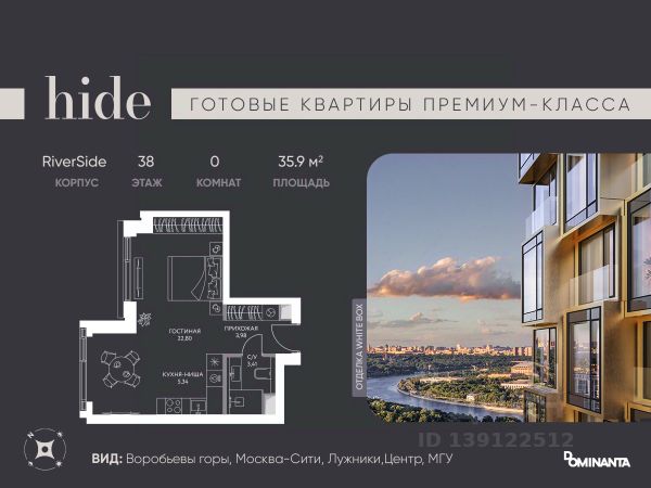 Прямая продажа от застройщика! Дом сдан, ключи в день покупки. Предлагается просторная 1-комнатная квартира 35.9 м² с отделкой white box на 38 этаже в проекте hide — жилом небоскребе премиум-класса от Dominanta и MR. ТОП-ВИДЫ НА 360: Воробьевы горы, Москва-Сити, Лужники, центр, МГУ, Парк Победы. ПРЕСТИЖНАЯ ЛОКАЦИЯ: Расположение на границе районов Раменки и Хамовники: быстро до ТТК, Москва-Сити, а рядом природа — Воробьевы горы и заказники Долины реки Сетунь. КОМФОРТ НОВОГО УРОВНЯ: панорамное остекление, "Умный дом", продуманная планировка евроформата. LIFE SPACE ДЛЯ РЕЗИДЕНТОВ: видовая терраса, хоум-офис, фитнес зал, бьюти-кабинет, общественная гостиная. Более 50% двора — ландшафтный парк с холмами и "парящими" мостами. СПЕЦИАЛЬНОЕ ПРЕДЛОЖЕНИЕ: скидка 10% при полной оплате и ипотеке без субсидий — действует до 28.02.2026. Не упустите шанс!