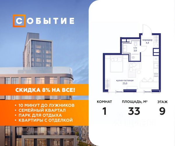 Весь март - скидка до 8% действует до 31.03.2026 г. при 100% оплате и не субсидированной ипотеке! В продаже студия от застройщика. Общая площадь 33.00, жилая 16.50, кухня 8.5. Квартира расположена на 9 этаже жилого квартала "Событие-6", корпус 1, Секция Секция 3. Квартира с чистовой отделкой. Срок сдачи: 4 кв. 2029 года. СОБЫТИЕ.6 — финальный дом парк-квартала СОБЫТИЕ на Мосфильмовской. Переезжайте в уже сформированный квартал с готовой инфраструктурой и парком! Премиальный жилой комплекс в престижном районе Москвы предлагает стильную архитектуру, продуманное благоустройство и великолепно разнообразие общественных пространств. Свой парк прямо возле дома! Архитектура Архитектура СОБЫТИЯ.6 выполнена в ультрасовременном стиле московским бюро Atrium на основе дизайн-кода британских архитекторов LDA Design и UHA London. Дом отличает оригинальная геометрия фасадов, большое остекление и высокие лобби (до 6,2 м) с авторской мебелью и светильниками. Расположение Мосфильмовская улица (Раменки) — один из престижных районов Москвы. Близость к историческому и деловому центру, природным зонам Запада столицы. Транспортная доступность: • 10 мин до Москва-Сити и ТТК; • 15 мин до Садового кольца; • 25 мин до аэропорта Внуково; • 7-10 мин до станций метро "Аминьевская" и "Мичуринский проспект". Инфраструктура: • парк "Событие" (12 га, финалист конкурса Правительства Москвы) с беговыми (1,5 км) и велодорожками (2,7 км), экотропой (1,6 км), площадками, лекторием; • школа, детский сад, магазины, салоны красоты, рестораны (к моменту заселения); • мультидвор с игровыми и спортивными площадками, мини-бульваром; • общественная терраса на 10-м этаже (коворкинг, лаунж); • Закрытые общественные пространства: детская комната, спортивный зал, коворкинг, лаунж-зоны. Паркинг 256 мест для жителей (48 — для электромобилей), 24 гостевых (5 — для электромобилей), мойки колес, кладовые, зоны для велосипедов. Окружение Парки и заповедники (Воробьёвы горы, Матвеевский лес и др.), МГУ, театр им. Н. И. Сац, стадион "Лужники". Безопасность Видеонаблюдение, контроль доступа, видеодомофоны, консьерж-сервис 24/7, системы пожарной безопасности и мультисервисная оптическая сеть.