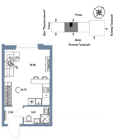 Продается 1комнатная квартира на 4 этаже от застройщика Страна Девелопмент. Площадь квартиры 26,86 кв. м.