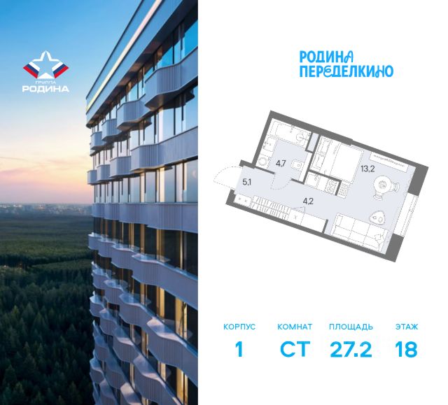 Продаётся студия площадью 27.2 м² на 18 этаже в Жилом Комплексе "Родина Переделкино". Первый в России киберспортивный кластер от Группы Родина. Это жилой квартал бизнес-класса на Западе Москвы на границе с Ульяновским лесопарком, состоящий из пяти высотных зданий с подземной одноуровневой автостоянкой. В жилом комплексе широкий выбор вариантов жилья — от компактных студий до просторных 5-комнатных квартир. Помимо комфортных европланировок, представлены уникальные форматы: квартиры с панорамными гостиными, квартиры с террасами на 2 этаже. Преимущества расположения: • 3 минуты пешком до метро "Новопеределкино" • Лесные массивы - чоботовский лес, ульяновский лесопарк и мещерский природный парк. • Прямой выезд на Боровское Шоссе • 30 минут транспортом до делового центра Москва - Сити • 10 минут на машине до аэропорта "Внуково" Развитая инфраструктура: • 5 жилых корпусов • Деловой центр с Welness и SPA • Мультиарена с развлекательным digital - центром • Гастроулица: кофейни, рестораны, стритфуды