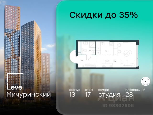 Цена указана с учётом скидки при 100%-й оплате, несубсидированной ипотеке, рассрочке (кроме программы "Рассрочка 0%"). В жилом квартале, расположенном на границе с природным заказником "Долина реки Очаковки", продаётся студия площадью 22.30 кв.м без отделки. Квартира расположена на 2 этаже 24-этажного корпуса 7 в жилом комплексе бизнес-класса Level Мичуринский (компания Level Group/Левел групп). Отличная транспортная доступность - 10 мин. пешком до станции метро "Мичуринский проспект" - 15 мин. пешком до станции метро "Аминьевская" - 7 мин. на авто до МКАД - 10 мин. на авто до ТТК - 15 мин. на авто до Москва-Сити Продуманный архитектурный проект - Выразительная архитектура от известных бюро: корпуса 1-6 - СПИЧ, корпуса 7-13 - Borisov Architects; - Из окон открываются живописные виды на парки, Москва-Сити и МГУ; - Высокие потолки до 6,35 м; - Стильные лобби с окнами в пол и высокими потолками до 4,7 м; - С каждого этажа дома на лифте можно спуститься в подземный отапливаемый паркинг. Расположение Level Мичуринский строится в одном из самых зеленых районов Москвы - Очаково-Матвеевское. Этот уголок столицы идеален для поддержания здорового образа жизни. В шаговой доступности от проекта находятся заказник "Долина реки Очаковки" - 1 мин. пешком и Очаковский парк - 7 мин. пешком. На велосипеде можно добраться до таких парков, как "Событие", парк Олимпийской деревни, парк 50-летия Октября и парк Школьников. В 15-минутной доступности на авто расположено более 30 детских садов (из них 14 в пешей доступности), 32 школы (из них 13 в пешей доступности) и 14 вузов. В ближайшем окружении работает более 25 медицинских учреждений, 11 спортивных клубов и 22 продуктовых супермаркета. Внутренняя инфраструктура На территории жилого комплекса строится три детских сада и школа. На первых этажах домов откроется супермаркет, фитнес-центр, ресторан, кафе и другие сервисы. Подземные этажи займут паркинги: трехуровневые в этапах 1 и 2, одноуровневый в этапах 3 и 4. Преимущества проекта - 4,5 га благоустроенной территории с видовым мостом, уличным кинотеатром, зонами для тихого отдыха, работы, воркаута, площадки для петанка, футбола, настольного тенниса и пляжного волейбола; - Дизайнерские лобби с панорамным видом на двор, мойками для лап животных и комфортными зонами ожидания. - Безопасность жителей: круглосуточное видеонаблюдение всех зон общего пользования (лобби, лифты, паркинги, детские площадки), система контроля доступа, управление видеодомофоном через мобильное приложение, единый ключ доступа на территорию жилого комплекса. - Технологии и комфорт: высокоскоростной Wi-Fi в лобби и на придомовой территории, автоматическая система контроля и учета ресурсов, абонентская связь с консьержем, распознавание номеров автомобилей при въезде/выезде в/из паркинга.