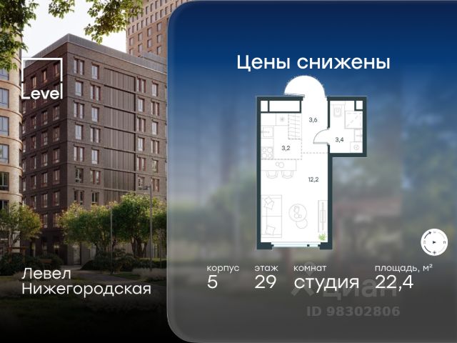 Цена указана с учётом скидки при 100%-й оплате, несубсидированной ипотеке, рассрочке (кроме программы "Рассрочка 0%"). В активно развивающемся районе на юго-востоке столицы продается студия площадью 22,4 кв.м c предчистовой отделкой. Квартира расположена на 29 этаже 29-этажного этажного корпуса 5 в жилом комплексе комфорт-класса Левел Нижегородская (компания Level Group/Левел групп). Отличная транспортная доступность - 10 мин. пешком до станции метро, МЦД-4, БКЛ и МЦК "Нижегородская"; - 13 мин. пешком до станций метро "Андроновка" и "Перово"; - 10 мин. на авто до ТТК; - 14 мин. на авто до Садового кольца. Благоустройство Благоустроенная территория комплекса делится на внешнюю и внутреннюю. Внутренняя часть - это закрытый двор 0,9 га, где обустраиваются детские площадки для разных возрастных групп, беседки для отдыха и работы, несколько спортивных зон, включая зоны для уличных тренировок и лужайку для бадминтона. Здесь же появится ухоженный луг с прогулочными маршрутами. Рядом с жилым комплексом будет создан ландшафтный парк площадью 2,4 га. В парке будут высажены высокие деревья, луговые травы и кустарники, благоустроены лаунж-зоны у пруда, дорожки для бега и прогулок. В центре парка предусмотрена событийная площадь, рядом расположатся дополнительные спортивные и детские площадки, а также зона для выгула домашних питомцев. Внутренняя инфраструктура Дома жилого комплекса будут оснащены коммерческими помещениями, где откроются все необходимые сервисы: магазины, аптеки, салоны красоты, кофейни, службы доставки и многое другое. Комфорт - это когда всё рядом. Кроме того, на территории жилого комплекса Левел Нижегородская предусмотрен подземный отапливаемый паркинг. Этап 1 включает 335 машино-мест и 143 кладовых помещения для хранения сезонных вещей. Технологии и безопасность На территории всех общественных зон постоянно ведется видеонаблюдение и предусмотрен высокоскоростной вайфай. Подъезды, паркинг и внутренний двор оснащены системой контроля доступа. Для удобства жителей создано мобильное приложение, позволяющее связаться с управляющей компанией, осуществлять удаленное управление видеодомофоном или просмотреть изображение отдельных видеокамер по заявке. Для безопасного перемещения по этажам и комфортного спуска в паркинг будут установлены современные лифты от компании BLT Brilliant Elevator. Скорость лифтов - 1,6 - 2,5 м/с. Особенности - Архитектура от экспертов из бюро ARCH(E)TYPE; - Разноуровневая застройка - от секций средней этажности до высоток в 45 этажей (этап 1); - Окна шириной до 2,2 метров (этап1) с видами на Останкинскую башню, Измайловский парк, "Москва-Сити" и Кусковский лесопарк; - Лобби с окнами в пол и потолками от 3,4 метров, оснащенные консьерж-сервисом; - Более 35 видов планировок, включая редкие форматы. Артикул 5-333.