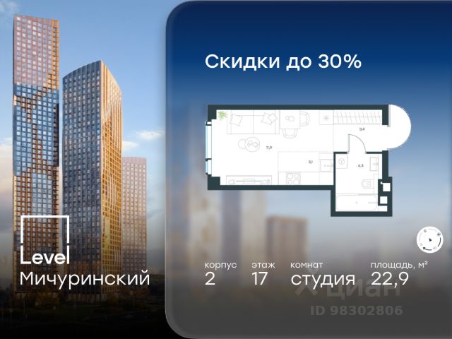 Цена указана с учётом скидки при 100%-й оплате, несубсидированной ипотеке, рассрочке (кроме программы "Рассрочка 0%"). В жилом квартале, расположенном на границе с природным заказником "Долина реки Очаковки", продаётся студия площадью 22.20 кв.м без отделки. Квартира расположена на 22 этаже 42-этажного корпуса 2 в жилом комплексе бизнес-класса Level Мичуринский (компания Level Group/Левел групп). Отличная транспортная доступность: - от 10 мин. пешком до станции метро "Мичуринский проспект" - 15 мин. пешком до станции метро "Аминьевская" - 7 мин. на авто до МКАД - 10 мин. на авто до ТТК - 15 мин. на авто до Москва-Сити Продуманный архитектурный проект: - Выразительная архитектура от известных бюро: корпуса 1-6 - СПИЧ, корпуса 7-13 - Borisov Architects; - Из окон открываются живописные виды на парки, Москва-Сити и МГУ; - Высокие потолки до 6,35 м; - Стильные лобби с окнами в пол и высокими потолками до 4,7 м; - С каждого этажа дома на лифте можно спуститься в подземный отапливаемый паркинг. Расположение: Level Мичуринский строится в одном из самых зелёных районов Москвы - Очаково-Матвеевское. Этот уголок столицы идеален для поддержания здорового образа жизни. В шаговой доступности от проекта находятся заказник "Долина реки Очаковки" - 1 мин. пешком и Очаковский парк - 7 мин. пешком. На велосипеде можно добраться до таких парков, как "Событие", парк Олимпийской деревни, парк 50-летия Октября и парк Школьников. В 15 минутах езды на авто расположено более 30 детских садов (из них 14 в пешей доступности), 32 школы (из них 13 в пешей доступности) и 14 вузов. Также в ближайшем окружении - более 25 медицинских учреждений, 11 спортивных клубов и 22 продуктовых супермаркета. Внутренняя инфраструктура: На территории жилого комплекса строится три детских сада и школа. На первых этажах домов откроется супермаркет, фитнес-центр, ресторан, кафе и другие сервисы. Подземные этажи займут паркинги: трёхуровневые - в этапах 1 и 2, одноуровневый - в этапах 3 и 4. Преимущества проекта: - 4,5 га благоустроенной территории с видовым мостом, уличным кинотеатром, зонами для тихого отдыха, работы, воркаута, площадки для петанка, футбола, настольного тенниса и пляжного волейбола. - Дизайнерские лобби с панорамным видом на двор, мойками для лап животных и комфортными зонами ожидания. - Безопасность жителей: круглосуточное видеонаблюдение всех зон общего пользования (лобби, лифты, паркинги, детские площадки), система контроля доступа, управление видеодомофоном через мобильное приложение, единый ключ доступа на территорию жилого комплекса. - Технологии и комфорт: высокоскоростной Wi-Fi в лобби и на придомовой территории, автоматическая система контроля и учёта ресурсов, абонентская связь с консьержем, распознавание номеров автомобилей при въезде в паркинг и выезде из него.