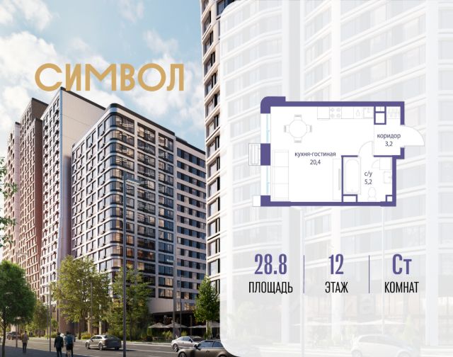 Продается квартира-студия от застройщика: общая площадь 28.80 м², жилая 10.00 м², кухня 10.40 м², 12-й этаж, жилой квартал "Гордость", корпус 36 (секция 5). Срок сдачи: 2 квартал 2029 года. Позвоните сейчас и забронируйте квартиру! Квартал бизнес-класса СИМВОЛ - это городское пространство нового поколения в историческом районе Лефортово, на границе ЦАО, в 2 км от Садового кольца. Бионическая архитектура СИМВОЛА превратила Лефортово в суперсовременное и модное пространство. Из окон, с балконов и террас просторных квартир СИМВОЛА открываются отличные виды на город и новый парк "Зеленая река", "протекающий" через все кварталы комплекса на 2 км. В квартале уже есть все, что нужно для комфортной жизни: кафе и рестораны, супермаркеты и магазины, медицинские и физкультурно-оздоровительные центры, салоны красоты и барбершопы, аптеки и оптики, химчистки, пункты доставки и другие сервисы - всего более 90 действующих объектов внутриквартальной инфраструктуры. Для юных жителей СИМВОЛА открыты детский сад и инженерный лицей при МГТУ им. Баумана. Особенности квартала: • Свой парк "Зеленая Река" - 10 га зелени и развлечений на любой вкус! • Уникальная для Москвы архитектура - Проект создан архитектурной мастерской ATRIUM по дизайн-коду британских бюро LDA Design и UHA London. • Богатая инфраструктура с детскими садами и лицеем им. Баумана, кафе и ресторанами, супермаркетами и аптеками, зоной для фитнеса, бассейном и мед. центром. • Квартиры с панорамными окнами, террасами, ванными с окнами и каминами редких форматов. • Закрытые безопасные зелёные дворы-парки без машин!