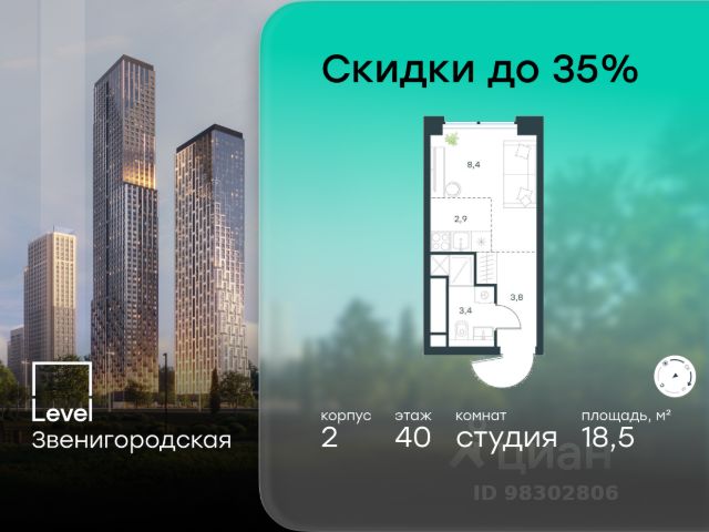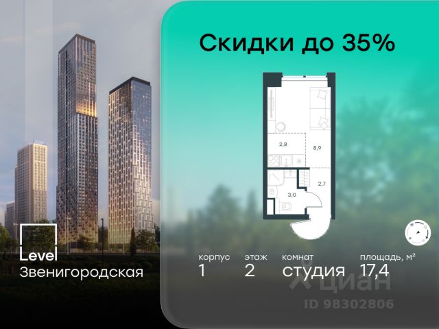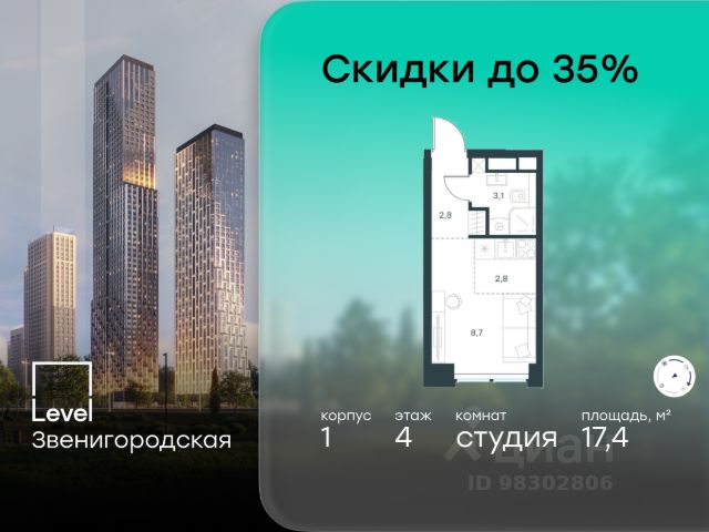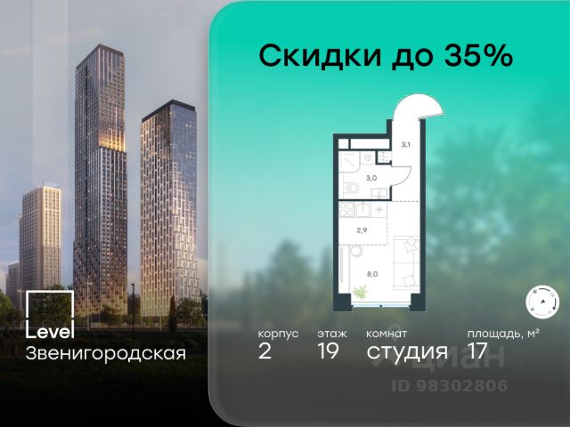 Цена указана с учётом скидки при 100%-й оплате, несубсидированной ипотеке, рассрочке (кроме программы "Рассрочка 0%"). В жилом квартале продаётся студия площадью 17.40 кв.м white box. Квартира расположена на 2 этаже 48 этажного корпуса 1 в жилом комплексе комфорт класса Level Звенигородская (компания Level Group/Левел групп). Отличная транспортная доступность - 5 мин. пешком до метро "Звенигородская" (откроется к окончанию строительства); - 18 мин. пешком до станции МЦК "Хорошёво" и станции БКЛ "Народное ополчение"; - 4 мин. на авто до ТТК; - 8 мин. на авто до Садового кольца; - 15 мин. на авто до Кремля. Продуманный архитектурный проект - Концепция от студии Станислава Михаловского, в основу которой легло единение природы и города; - Двухкамерные стеклопакеты в окнах, алюминиевый и ПВХ профиль - в квартирах тепло зимой и прохладно летом; - С верхних этажей откроются панорамные виды на город, Москву-реку, "Москва-Сити" и Москворецкий парк; - Лобби со всеми удобствами: окна в пол, высокие потолки до 4,7 м, лаунж-зоны, колясочные, гостевые санузлы и мойки для лап животных; - Централизованные водонагреватели гарантируют круглогодичную подачу горячей воды в каждую квартиру. Благоустройство Концепция благоустройства разработана совместно с бюро UNK landscape. Высота башен приближается к 200 метрам - они словно касаются неба. Небесный простор проецируется на территорию двора с помощью подсветки, визуально увеличивая пространство и отражаясь в авторских элементах архитектуры. На территории площадью 0,45 га расположатся: - "Облако событий" - место встреч и общения; - "Облако спорта" - всё для поддержания себя в форме; - "Облако принятия решений" - пространство для работы на свежем воздухе; - "Облако спокойствия" - для отдыха в тишине природы; - "Облако игр" - площадки для подростков и самых маленьких. Инфраструктура В жилом комплексе откроется 21 коммерческое помещение: продуктовые лавки, кафе, салоны красоты, службы доставки и творческие студии. Этап 1 включает строительство двухуровневого подземного паркинга. Всего здесь расположится 351 машино-место, включая семейные места, и 264 кладовых помещения. В распоряжении жителей развитая инфраструктура района: 15 супермаркетов, 5 спортивных объектов, 9 медучреждений, 7 детских садов, 4 школы, 3 благоустроенных парка - всё в шаговой доступности. Инженерия Комфортное перемещение внутри домов будут обеспечивать надёжные лифты с доступом в паркинг с жилых этажей. В каждом корпусе предусмотрено до шести кабин, включая сервисные лифты. Попасть на территорию комплекса можно только по единому ключу доступа. Видеонаблюдение установлено на входах в подъезды, в лобби, в общих зонах, на въезде в паркинг. Гости смогут связаться с жителями дома через входные видеопанели, а управлять доступом на территорию можно через видеодомофон или приложение на телефоне.