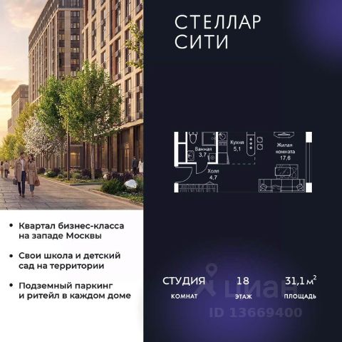 Продается квартира от надежного застройщика Tashir Estate в квартале бизнес-класса Stellar City в ЗАО Москвы. Площадь квартиры составляет: 31.1 кв. м, потолки: 3.1 м Квартира находится на 18 этаже, 4 корпуса жилого квартала Stellar City — микрогорода будущего на орбите Москвы. Stellar City — квартал в ЗАО Москвы вблизи инновационного центра Сколково. В окружении — 11 парков и природных зон, в том числе Долина реки Сетунь, Мещерский лес и парк развлечений The Rink. Город в городе Чтобы дом и инфраструктура вокруг отвечала динамичному лайфстайлу жителя мегаполиса, в основу проекта легла концепция город в городе, которая позволяет решать все бытовые вопросы in-home. В квартале будут возведены школа и детский сад, воркаут-зоны, променад, вело и беговые дорожки, детские площадки для каждого корпуса, а также коммерция на первых этажах для ежедневных покупок. Все необходимое — на расстоянии нескольких шагов. Изящные и лаконичные лобби Авторский дизайн, натуральные материалы в отделке и безупречный интерьер вне времени. Лобби и холлы в проекте бизнес-класса Stellar City ничем не отличаются от входных групп в премиум-сегменте благодаря качественным европейским материалам в отделке, стильному дизайну, консьерж-сервису и уютной зоне ожидания с журнальными столиками и мягкой мебелью. Комфорт и безопасность Закрытая территория, охрана, система СКУД, специально разработанное мобильное приложение дома для резидентов и подземный паркинг с круглосуточным наблюдением и доступом с помощью автоматического считывания номера авто.