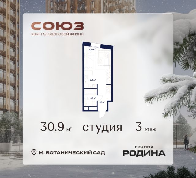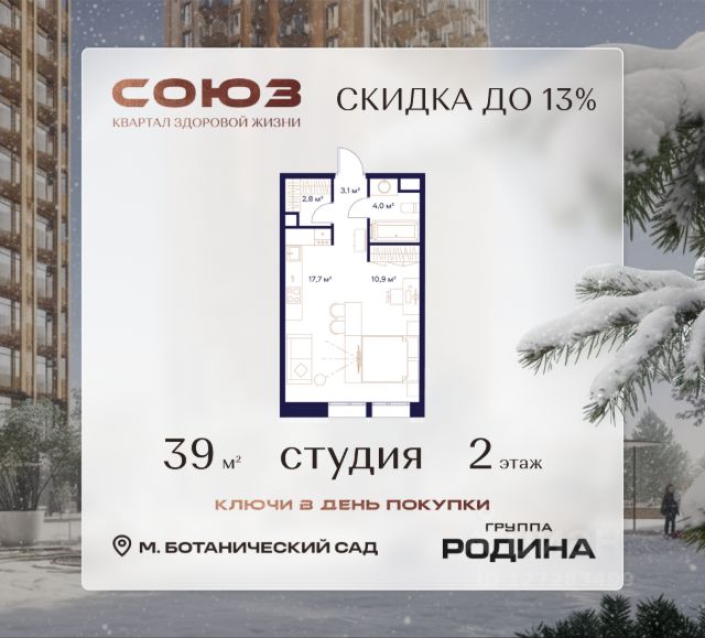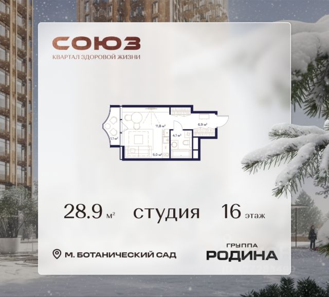 Рассрочка 0% Продаётся квартира-студия площадью 28.9 м² на 16 этаже в Жилом Комплексе "Союз". Квартал здоровой жизни премиум-класса с рекордным количеством олимпийских видов спорта: - Ледовая арена для хоккея и фигурного катания, - Футбольные поля для тренировок, - Спортивный зал для фехтования, - Бассейн на 6 дорожек, - Центр единоборств, - 4 крытых площадки для настольного тенниса, - 7 теннисных кортов (крытых и открытых), - 4 крытых площадки для сквоша, - Легкоатлетический стадион, - Площадки для баскетбола и волейбола. Уникальные форматы квартир с мастер-спальнями, приватными террасами, балконами, а также пентхаусы с открыточными видами на город. Все квартиры продаются с отделкой Shell&Core и панорамным остеклением. Расположение Пешком: - 2 мин. до парка "Сад Будущего"; - 6 мин. до ст. м. "Ботанический сад"; - 6 мин. до ст. МЦК "Ботанический сад"; - 6 мин. до парка "Леоновская роща"; На автомобиле: - 2 мин. до СВХ (МСД); - 5 мин. до Проспекта Мира; - 10 мин. до ТТК; - 15 мин. до Садового кольца; - 25 мин. до аэропорта "Шереметьево". Благоустройство - собственная спортивная инфраструктура 7 Га; - зона для пикников; - игровые и спортивные площадки для детей всех возрастов; - розарий, а также сосновые, каштановые и дубовые аллеи; - площадки под открытым небом для занятий спортом и йоги; - игровые комнаты для детей; - лаунж-зона для резидентов; - просторная переговорная для деловых встреч; - премиальный ресторан "Шабада" Сосо Павлиашвили с водными арт-объектами на прогулочной аллее, садом ароматных трав и сценой под открытым небом; - кафе, химчистки, аптеки и супермаркеты рядом с домом. Окружение - 8 парков: Сад Будущего, Леоновская роща, Хуамин, Главный ботанический сад РАН, Шереметьевская дубрава, Останкино, парк спорта "Яуза", пойма реки Яуза и музей-усадьба "Останкино"; - 3 ВУЗа: ВГИК, РГСУ, МГПУ; - 12 школ, в том числе: школа 1499 им. И.А. Докукина (топ 100), Brookes Moscow, IThub школа; - 18 детских садов, в том числе билингвальный ALERTUM KIDS; - один из крупнейших океанариумов Европы "Москвариум"; - один из крупнейших в Европе торгово-развлекательных центров "Европолис".