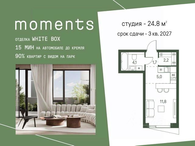 Цены указаны с условием 100% оплаты и стандартной ипотеки. Продается студия номер 907 общей площадью 25.8 кв.м. на 5-м этаже 34 этажного дома, корпус 2.2. С отделкой White Box. Moments — ЖК бизнес-класса, расположен на расстоянии вытянутой руки от старинного усадебного парка Покровское-Стрешнево. Moments — это единение города и природы, дом, который помогает обрести гармонию и баланс в жизни. Moments расположен на Волоколамском шоссе с удобным выездом в центр и в область, а также с расположенными в пешей доступности объектами транспортной инфраструктуры (МЦК и МЦД-2). Жилой комплекс будет состоять из 3 очередей — 8 корпусов высотой от 4 до 47 этажей. Здания будут расположены под разными углами для максимальной открытости солнцу и максимально роскошным видовым характеристикам. Внутренний двор: Иммерсивное благоустройство от британского бюро Gillespies и West8 сфокусировано на эмоциональном и чувственном опыте. Каждая прогулка по Moments погружает в путешествие со сменой сценариев и плавным потоком уникальных моментов. - Пешеходная экотропа,которая соединяет комплекс с парком Покровское-Стрешнево - Двор с фонтаном - Зеленые сады и лаунж-зоны - Пространства для пикников и общения - Зоны активного отдыха. Детские и спортивные площадки - Пешеходные тропы и велодорожки - Разнообразная коммерческая инфраструктура - Детский сад на 175 мест - Школа на 300 мест - Игровые площадки из натуральных материалов - Сенсорные сады - Безбарьерное зонирование