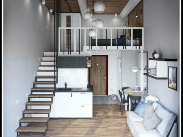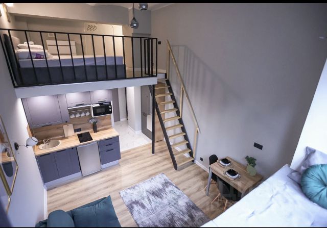 В апартаментах УДОБНАЯ ПЛАНИРОВКА И РАССТАНОВКА МЕБЕЛИ: отдельное уютное спальное место для двоих человек, большой шкаф-гардероб ИКЕА, кухонный гарнитур с техникой (варочная панель на две конфорки и холодильник) ИКЕА, фартук из натурального мрамора, кондиционер, французский балкон. Ремонт полностью обновлен под себя с использованием премиум-материалов. В апартаментах жил арт-директор: стиль интерьера сочетает лофт-элементы (например, открытый бетон на потолке) с теплыми по настроению материалами — паркетная доска на полу. Стоят дорогие жалюзи. В ванной комнате — стиральная машина. Можно заезжать и жить сразу.