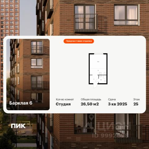 Продаётся квартира-студия площадью 29,6 кв.м на 11 этаже 32 этажного дома (Корпус 8, Секция 3) проекта ПИК Барклая 6. Светлый просторный подъезд на уровне земли, функциональная планировка, большие окна, предчистовая отделка. Жилой квартал "Барклая 6" расположен в районе Филёвский Парк, рядом с набережной Москвы-реки и парком "Фили". В 10 минутах пешком находятся станции метро "Парк Победы" и "Фили", до "Багратионовской" можно дойти за 8 минут. На машине через новый путепровод доехать до Кутузовского проспекта получится за 3 минуты, до ТТК — за 10 минут. В уютном проекте "Барклая 6" восемь жилых домов с переменной этажностью — 12, 24 и 32 этажа, подземный паркинг, детский сад на 125 малышей и начальная школа на 225 детей. Внутри квартала появится приватный парк для жителей, где можно гулять, играть на детских и спортивных площадках. На территории парка будет Wi-Fi, в лавочках предусмотрены разъёмы для USB-зарядок. На первых этажах откроются полезные сервисы, магазины и кафе, куда можно будет спуститься за кофе в домашних тапочках. Уникальную архитектуру домов подчеркнёт подсветка фасадов. В светлых лобби, оформленных по индивидуальному дизайн-проекту, предусмотрены удобные зоны ожидания, гостевая туалетная комната и лапомойки для собак, чтобы питомцы попадали в квартиру уже чистыми. Район вокруг "Барклая 6" хорошо развит. Здесь много школ и детских садов, работают поликлиники, спортивные школы и дворец водных видов спорта "Фили". Рядом — магазины и торговые центры. В планах города Москвы обновить район рядом с "Барклая 6". Уже расширена улица Барклая и запущен путепровод для прямого и удобного выезда на Кутузовский проспект, а по его дублеру, Проспекту Багратиона, сможете быстро доехать до "Москва-Сити" или МКАД. Изменится "Горбушкин двор": здесь реконструируют старые здания, построят новые дома, офисы, школы и детские сады. Со временем окружение жилого квартала станет более современным и аккуратным. Артикул 814037 (Застройщик АО "СПЕЦИАЛИЗИРОВАННЫЙ ЗАСТРОЙЩИК"ФИЛИТ")