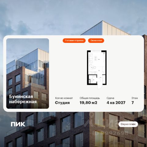 Продаётся квартира-студия площадью 20,4 кв.м на 13 этаже 16 этажного дома (Корпус 2.6/1.2, Секция 2) проекта ПИК Бунинская набережная. Светлый просторный подъезд на уровне земли, функциональная планировка, большие окна, предчистовая отделка. Удобное расположение: 18 минут пешком от м. "Потапово" и 12 минут на автомобиле до станции "Бунинская аллея". 12 минут на автомобиле до трассы Солнцево — Бутово — Варшавское шоссе. 20 минут на автомобиле до МКАД и Калужского шоссе. 1520 минут езды до живописных парков: "Бутовский лесопарк", заказник "Южное Бутово". Особенности проекта Камерный квартал в Новой Москве, на берегу Ивановского пруда. Одна из ключевых особенностей проекта — квартиры с панорамным видом на воду. Архитекторы вдохновились локацией проекта: природные оттенки и активная пластика корпусов напоминают рельефные выступы на берегу, а окна отражают водную гладь, визуально объединяя дома с природой. Преимущества проекта Светлые и просторные лобби с зонами ожидания. Подземный паркинг. Набережная и пешеходная аллея для прогулок. Парк на склоне с игровой зоной. Готовая инфраструктура района: 3 школы, 6 детских садов, взрослая и детская поликлиники. Артикул 968752
