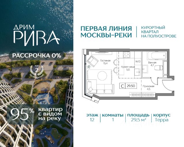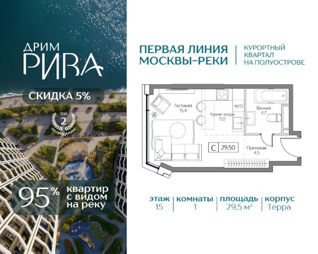 СТАРТ ПРОДАЖ ВИДОВЫХ КВАРТИР Квартира со 100% видом на Москву-реку в премиальном квартале Дрим Рива — первая линия Москвы-реки. На территории курортной локации "Остров мечты". 29.5 кв.м, Студия, 11 этаж. Высота потолков 3,1 м. • 95% квартир смотрят на воду • Мастер-спальня с гардеробной • Естественный свет в гостиной с двух сторон ЛОКАЦИЯ И ТРАНСПОРТ • 15 минут на авто до Садового кольца, • 30 минут до Москва-Сити и Кремля. • 10 минут до метро "Технопарк" в пешей доступности. В перспективе — станция "Остров мечты" (2028г.). ИНФРАСТРУКТУРА КВАРТАЛА • 3 Га приватного двор-парка с зонами для спорта, йоги и отдыха; • Благоустроенная набережная с гастропроменадом; • Клубные лобби с инфраструктурой; • Премиум SPA-центр с бассейном и фитнес-клуб; • Государственный детский сад под окном и школа в 10 минутах от квартала; • Подземный и гостевой паркинг. ИНФРАСТРУКТУРА ДЛЯ СЕМЕЙ — государственные детский сад и школа на территории. 44 гектара парков вокруг создают условия для прогулок, спорта и детск ого досуга. ПРИВИЛЕГИИ РЕЗИДЕНТОВ • Пляжный клуб Dream Beach Club; • Яхт-клуб Dream Yacht Club; • Вейк-клуб; • Парк развлечений "Остров мечты"; • 44 Га парков для прогулок и спорта в окружении квартала. БЕЗОПАСНОСТЬ И КОМФОРТ • Приватная территория; • Охрана; • Видеонаблюдение; • Консьерж-сервис 24/7; • Современные инженерные системы и технологии умного дома. НАДЕЖНЫЙ ЗАСТРОЙЩИК Regions Development — успешная девелоперская компания. За 20 лет работы реализовали уже более 30 проектов в сегментах коммерческой и многофункциональной недвижимости. Скидки действуют только при 100% оплате и ипотеке Скидки действуют только при 100% оплате, ипотеке и рассрочке. Скидки и акции не суммируются. Звоните, чтобы договориться о просмотре!