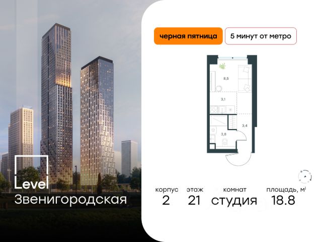 Цена указана с учётом скидки. В престижном районе Хорошёво-Мнёвники продаётся студия площадью 18.10 кв.м нет. Квартира расположена на 2 этаже 64 этажного корпуса Корпус 2 в жилом комплексе класса комфорт+ Level Звенигородская (компания Level Group/Левел групп). Отличная транспортная доступность - 5 мин. пешком до станции метро "Звенигородская" (откроется к окончанию строительства); - 18 мин. пешком до станции МЦК "Хорошёво" и станции БКЛ "Народное ополчение"; - 4 мин. на авто до ТТК; - 8 мин. на авто до Садового кольца; - 15 мин. на авто до Кремля. Продуманный архитектурный проект - Концепция от студии Станислава Михаловского, в основу которой легко единение природы и города; - Двухкамерные стеклопакеты в окнах, алюминиевый и ПВХ профиль - в квартирах тепло зимой и прохладно летом; - С верхних этажей откроются панорамные виды на город, Москву-реку, "Москва-Сити" и природно-исторический парк "Москворецкий"; - Лобби с окнами в пол и потолками до 4,7 м площадью до 79 кв. м, оснащенные всеми удобствами: стойки ресепшен, уютные лаунж-зоны, гостевые санузлы, помещения для мойки лап животных; - Централизованные водонагреватели гарантируют круглогодичную подачу горячей воды в каждую квартиру. Благоустройство Концепция благоустройства разработана совместно с бюро UNK landscape. Высота башен приближается к 200 метрам - они словно касаются неба. Небесный простор проецируется на территорию двора с помощью подсветки, визуально увеличивая пространство и отражаясь в авторских элементах архитектуры. На территории площадью 0,45 га расположатся: - "Облако событий" - место встреч и общения; - "Облако спорта" - все необходимое для поддержания себя в форме; - "Облако принятия решений" - пространство для работы на свежем воздухе; - "Облако спокойствия" - для отдыха в тишине природы; - "Облако игр" - площадки для подростков и самых маленьких. Инфраструктура На первых этажах и в стилобатной части комплекса откроется 21 коммерческое помещение: продуктовые лавки, кафе, салоны красоты, службы доставки и творческие студии. Этап 1 включает строительство двухуровневого подземного паркинга. Всего здесь расположится 351 машино-место, включая семейные места, 264 кладовых помещения для удобного хранения личных вещей. В распоряжении жителей также инфраструктура района: 15 супермаркетов, 5 спортивных объектов, 9 медучреждений, 7 детских садов, 4 школы, 3 благоустроенных парка - всё в шаговой доступности. Инженерия Комфортное перемещение внутри жилого комплекса будут обеспечивать надёжные лифты с доступом в паркинг с жилых этажей. В каждом корпусе предусмотрено 4-5 кабин, включая сервисные лифты. Попасть на территорию жилого комплекса можно только по единому ключу доступа. Видеонаблюдение установлено на входах в подъезды, в лобби, в общих зонах, на въезде в паркинг, в лифтах, детских площадках. Гости смогут связаться с жителями дома через входные видеопанели, управлять доступом на территорию можно через видеодомофон или приложение на телефоне.