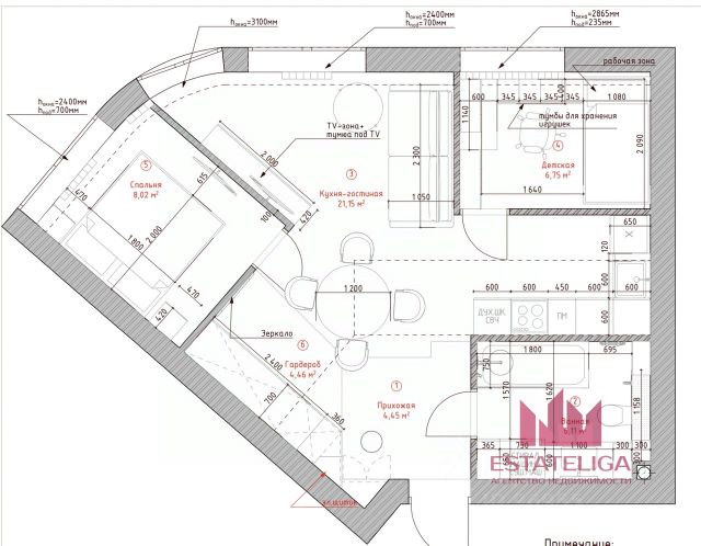 Выcoтa потолков куxня-гocтинaя 5,65 м (втоpой cвет), в ocтaльныx комнaтaх 2,8 м.