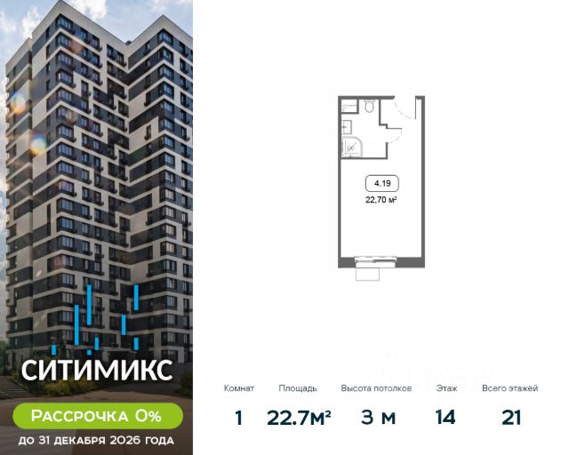 Продаётся студия в корпусе 4, общей площадью 21.29 м², на 14 этаже. Строительство корпуса завершено. Срок ввода — июль 2026 года. В 2026 году запланирован перевод корпуса в жилой фонд, что позволит собственникам оформить постоянную регистрацию в Москве. МФК "СИТИМИКС" — студии комфорт-класса, расположенные в районе Тропарёво-Никулино в Западном административном округе Москвы. Комплекс включает в себя пять 21-этажных корпусов и собственный парк между ними. Архитектурный облик комплекса, разработанный бюро "ADM", выполнен в современном стиле, а для наружной отделки, уникальной для каждого здания, использовались керамогранитные плиты разных оттенков, витражное остекление и натуральный камень. Все студии в новостройке оснащены современным оборудованием, включая счетчики с возможностью автоматического сбора данных. Во всех подъездах спроектированы уютные лобби-зоны и индивидуальные кладовые. Наличие обширного паркинга, где могут разместиться более 650 автомобилей, позволит закрыть зеленый дворик новостройки для проезда машин и обеспечить жителям уютное, комфортное пространство для семейного отдыха. Первые этажи займут коммерческие помещения, предназначенные для социально-бытовых объектов. В 10 минутах ходьбы расположен парк Школьников, на территории которого есть Очаковские пруды и протекает река Очаковка. В пешей доступности расположен еще один зеленый массив - Тропарёвский лесопарк, занимающий площадь в 218 га. Здесь проложены дорожки для велосипедистов, роллеров и бегунов, обустроены детские площадки и зоны отдыха. Рядом с комплексом находятся детские сады, школа, медклиника, центр развития ребенка, магазины, кафе и отделения банков. Идеальный вариант для студентов, т.к. City-комплекс расположен с такими университетами, как: РАНХиГС, РУДН, РТУ МИРЭА и РНИМУ им. Н.И. Пирогова. МФК "СИТИМИКС" находится в 1,5 км от станции метро "Озерная" и 2,4 км от станции метро "Юго-Западная. Автомобилистам будет удобно воспользоваться выездом на МКАД (3,2 км). Застройщиком квартала выступает компания APSIS GLOBE, основанная в 2008 году. В качестве девелопера компания успешно завершила ряд инфраструктурных, коммерческих объектов на территории Московской области, Москвы, Санкт-Петербурга.