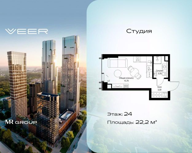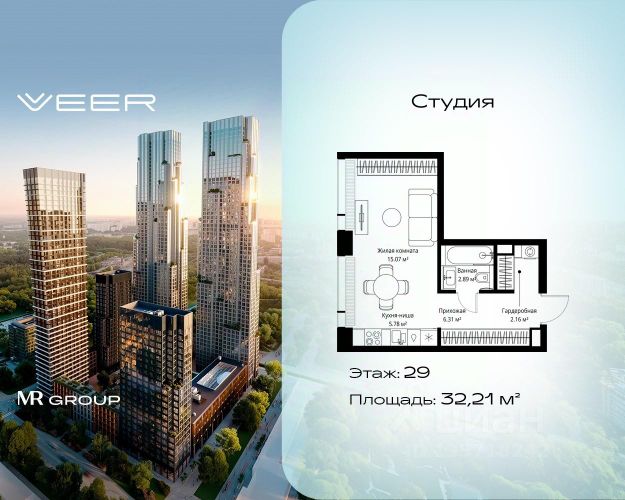 Старт продаж новой очереди! Продаётся студия общей площадью 31.64 м² без отделки в ЖК VEER на 35-м этаже 70 этажного дома. VEER.2 — вторая очередь футуристичного квартала бизнес-класса VEER. Это новая экосистема в престижном Западном округе Москвы, поражающая масштабностью внутренней инфраструктуры. ЖК находится всего в 5 минутах от Кутузовского проспекта и в 15 минутах от Сколково. Ансамбль из четырех стеклянных башен с доминантой в 237 метров разработан по принципу современного урбанизма и выражен в лаконичных объемах — параллелепипедах со сглаженными углами, которые придают зданиям утонченный вид. Расположение и транспортная доступность: • Образовательный комплекс в составе топовой школы, состоящий из двух зданий: основное на 1500 школьных и 450 дошкольных мест, отдельное здание детского сада на 300 мест. • Парк "Долина реки Сетунь" площадью более 700 гектаров • Рядом МГУ, МГИМО, РАНХиГС и Академия ФСБ • 15 минут по Кутузовскому проспекту до ужина в центре с видом на Москву-реку • 18 минут пешком до м. "Давыдково" • Открытие новых станций метро в шаговой доступности в будущем Инфраструктура: Двор в VEER.2 — это ассиметричные холмы, каменные "лабиринты", зеленые ковры и хвойные островки с единой живой экосистемой. Здесь есть все: • Павильон умиротворения Место отдыха под навесом в спокойной части двора, окруженное деревьями. • Активная тропа Тактильная дорога из камней разного диаметра для расслабляющих прогулок. • Бизнес-гарден Оборудованное пространство для работы на свежем воздухе со столом и встроенными розетками. • Детская площадка Двухуровневая площадка "Ботаника" с песочницей, переговорной трубой и горкой "Дружба". Компания MR предлагает своим клиентам специальные условия приобретения квартир в рамках программ ипотечного кредитования от банков-партнеров.