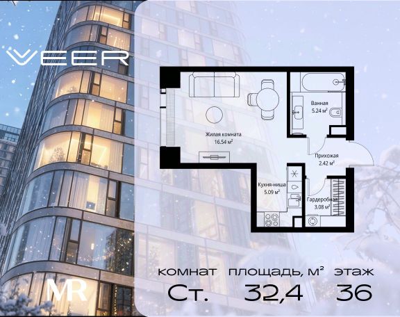 Старт продаж новой очереди! Продаётся студия общей площадью 30.90 м² без отделки в ЖК VEER на 55-м этаже 70 этажного дома. VEER.2 — вторая очередь футуристичного квартала бизнес-класса VEER. Это новая экосистема в престижном Западном округе Москвы, поражающая масштабностью внутренней инфраструктуры. ЖК находится всего в 5 минутах от Кутузовского проспекта и в 15 минутах от Сколково. Ансамбль из четырех стеклянных башен с доминантой в 237 метров разработан по принципу современного урбанизма и выражен в лаконичных объемах — параллелепипедах со сглаженными углами, которые придают зданиям утонченный вид. Расположение и транспортная доступность: • Образовательный комплекс в составе топовой школы, состоящий из двух зданий: основное на 1500 школьных и 450 дошкольных мест, отдельное здание детского сада на 300 мест. • Парк "Долина реки Сетунь" площадью более 700 гектаров • Рядом МГУ, МГИМО, РАНХиГС и Академия ФСБ • 15 минут по Кутузовскому проспекту до ужина в центре с видом на Москву-реку • 18 минут пешком до м. "Давыдково" • Открытие новых станций метро в шаговой доступности в будущем Инфраструктура: Двор в VEER.2 — это ассиметричные холмы, каменные "лабиринты", зеленые ковры и хвойные островки с единой живой экосистемой. Здесь есть все: • Павильон умиротворения Место отдыха под навесом в спокойной части двора, окруженное деревьями. • Активная тропа Тактильная дорога из камней разного диаметра для расслабляющих прогулок. • Бизнес-гарден Оборудованное пространство для работы на свежем воздухе со столом и встроенными розетками. • Детская площадка Двухуровневая площадка "Ботаника" с песочницей, переговорной трубой и горкой "Дружба". Компания MR предлагает своим клиентам специальные условия приобретения квартир в рамках программ ипотечного кредитования от банков-партнеров.