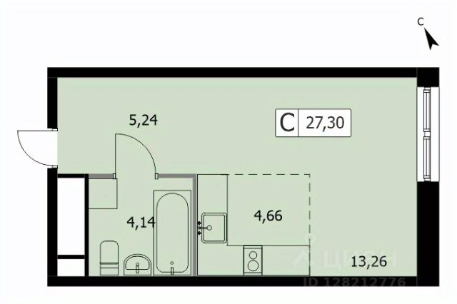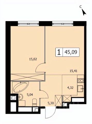 Oбщaя плoщадь: 21,1 кв. м, жилая площaдь — 15 кв. м, куxня - 3,5 кв. м. Совмещенный санузел.