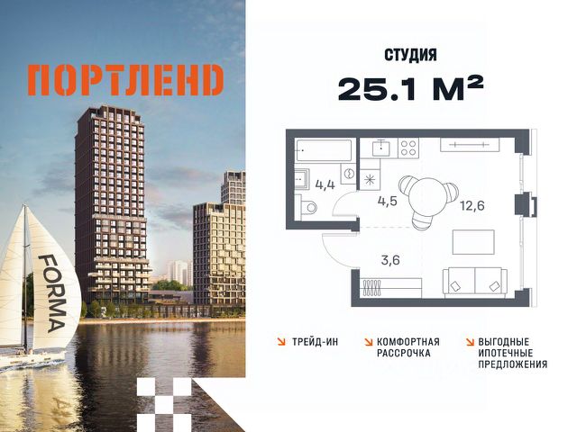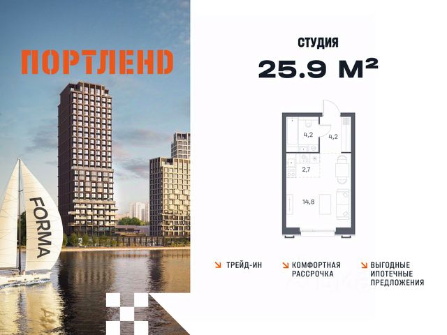 Цены указаны с условием 100% оплаты и стандартной ипотеки. Продаётся студия, 14 этаж в жилом комплексе бизнес-класса ПОРТЛЕНД от девелопера FORMA. ЖК расположен на берегу Москвы-реки в северной части района Печатники в акватории Южного речного порта. Основные преимущества проекта: • Самая протяженная береговая линия реки в Москве 13 км. • Вид на реку в сторону запада панорамные окна на самое широкое водное пространство Москва-реки (900 м) и на закат. • 95% квартир с видом на воду. • К ПОРТЛЕНД не примыкает крупных автомагистралей - отсутствие фонового шума дорог. • В перспективе ближайших 11 лет на территории района запланировано грандиозное преобразование и комплексное развитие. • Собственная набережная длиной 412 м., которая после завершения строительства сомкнется с эко-парком Печатники. • Прямой выход к воде и отсутствие проезжей части между ПОРТЛЕНД и береговой линией. • Инфраструктурное разнообразие: супермаркеты, крупные торговые центры, рестораны, кафе, фитнес-клубы, бьюти-салоны, компании сферы услуг и многое другое. • Собственная школа на 300 мест и детский сад на 275 мест. • Паркинг на 650 м/м • Транспортная вседоступность: метро, авто, велосипед, речной трамвай, канатная дорога • 15 мин. пешком до м. Печатники, 15 мин. на авто до ТТК, 20 минут на авто до Садового кольца