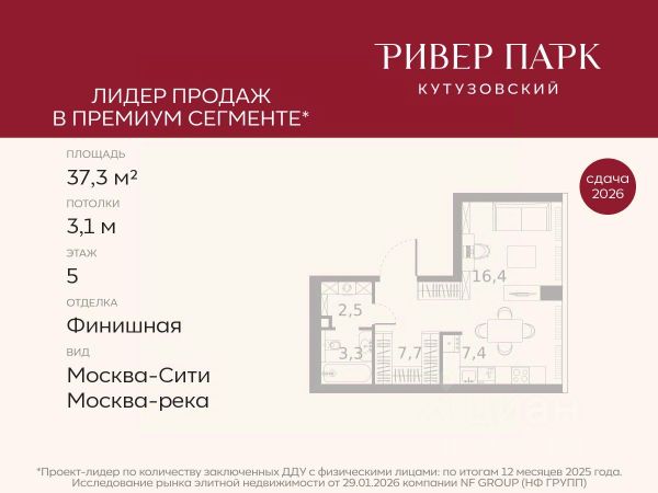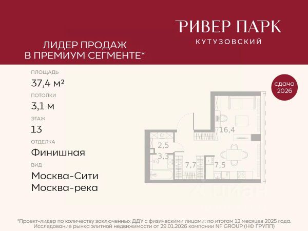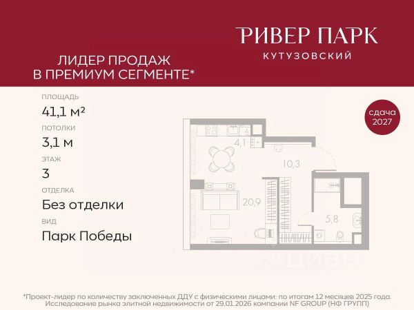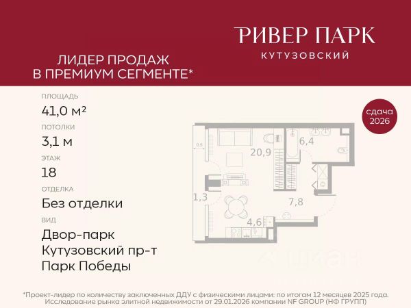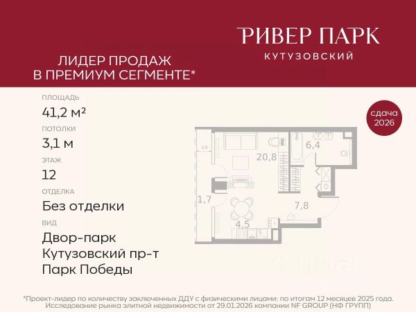 Продается студия площадью 41.2 кв.м. на 12-м этаже в жилом комплексе премиум-класса Ривер Парк Кутузовский в Башне Янтарь Премиальный жилой комплекс Ривер Парк Кутузовский строится в одном из самых престижных районов столицы Дорогомилово, на берегу Москвы-реки с лучшими видами на Москва-Сити. Яркий проект в стиле эко-футуризма станет самым масштабным и самым высотным ЖК в локации Кутузовского проспекта. Расположение и Транспортная доступность: • На берегу Москвы-реки, напротив Москва-Сити • 600 метров до Кутузовского проспекта • Удобный съезд с ТТК • Прямой выезд на МКАД по Проспекту Багратиона. • В пешей доступности 3 станции метро: Фили, Парк Победы, Кутузовская, а также станция МЦД Фили. Архитектура от именитого бюро ADM отличается уникальной пластикой фасадов - башни словно парят в воздухе, играя гранями как драгоценные камни. Жилой комплекс состоит из 5-ти небоскребов с приватным парком 2 Га и внешней торговой галереей с открытым доступом. В закрытом внутреннем дворе уникальная по насыщенности клубная инфраструктура только для жителей: • Площадка Мультиспорт (баскетбол, футбол, воллейбол, большой теннис) • Детский игровой клуб Немо • Музыкальная студия • Клуб Гедонист с бильярдной • Студия стиля для стилистов и массажа • Гольф-симулятор • Караоке Впервые в Москве лаунж-зоны на крыше небоскребов, только для жителей: • Всесезонные беседки иглу • Джакузи • Гриль • Площадка для занятий йогой • Самые высоки качели на крыше в России • Видовые площадки Благоустройство комплекса занимает 3 гектара и разработано мировым экспертом по городским парковым ландшафтам - голландским бюро WEST8. Концепция проекта дать жителям отдохнуть от городского ритма и расслабиться среди природы. В Приватном парке уже высажены хвойные деревья-крупномеры сосны и ели. • Зеркальный пруд с арт-объектом • Две детские площадки • Точка спорта с тренажерами и турниками • Цветущий сад • Зеленый театр со сценой и проектором • Видовая зона отдыха с очагом • Солнечная терраса с лежаками На территории жилого комплекса планируется строительство коммерческого образовательного центра, включающего детский сад на 200 мест и школу на 460 мест.