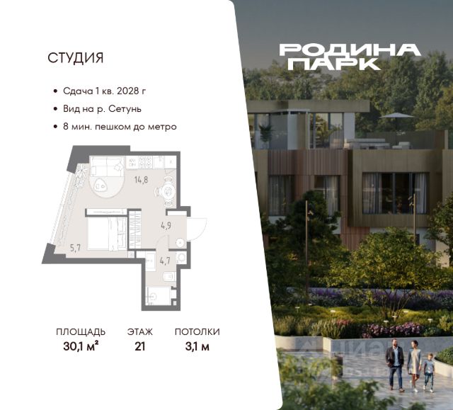В жилом кластере Родина Парк рядом с природным заказником Долина реки Сетунь продаётся квартира студия. Продуманная европланировка, которую легко зонировать под ваши запросы. Потолки от 3,1 м. "Родина Парк" — премиальный семейный кластер с образовательным медиакластером, строящийся на западе Москвы в окружении природного заповедника "Долина реки Сетуни". • Скидки недели на избранный пул лотов • Рассрочка 0% на выгодных условиях до 2 лет • Семейная ипотека, подбор комбо-вариантов ипотечных программ прямо в офисе продаж • Скидки 8% при 100% оплате или ипотеке. ЛОКАЦИЯ: 8 минут пешком до станции БКЛ "Давыдково". 12 минут на автомобиле до Нового Арбата. Удобные выезды на Кутузовский проспект, Аминьевское шоссе. ИНФРАСТРУКТУРА И СЕРВИСЫ ДЛЯ ЖИТЕЛЕЙ - Уникальная экосистема для развития, здоровья и творчества на территории 3,5 Га: - Первый в России образовательный медиакластер (с участием Русской медиагруппы) для творческого развития детей и взрослых с возможностью получить востребованную профессию в сфере шоу-бизнеса. - Инфраструктура и сервисы для семей с детьми на территории жилого кластера (частный детский сад, детские игровые пространства, творческие студии для занятий музыкой и танцами, безопасная и комфортная среда для детей и родителей), событийно-культурная площадка для проведения семейного досуга); - Здоровая среда (биохакинг-центр, фитнес-зал и спортивная инфраструктура во дворе, медитационные пространства, инженерные решения для освещения, свежего воздуха и очистки воды, сервисы красоты и поддержания активного долголетия); - Сервисы заботы (инфраструктура комфорта - подземный паркинг, кладовые, колясочные, консьерж- сервис, умный дом, мобильное приложение, профессиональная управляющая компания, сервисы охраны и обеспечение абсолютной безопасности) - Комьюнити резидентов (социальные пространства для дружеского и делового общения - летний атриум с уличным кинотеатром, зоны отдыха, кафе и рестораны, комьюнити-сервис с культурно- событийной программой в медиакластере); - Модуль благосостояния (комфортные пространства для работы и саморазвития - коворкинги и переговорные). ИНФРАСТРУКТУРА РАЙОНА: Насыщенная образовательная среда: филиалы МГИМО, МГУ, МГТУ, Сколково. Топовые школы: 6 лучших частных школ Москвы и области (Forbes) в 10 минутах езды. Природное окружение для пеших прогулок, спорта и отдыха. "Родина Парк" — это место, где растут и дети, и ваши возможности. Экосистема, где всё подчинено развитию — физически, профессионально, творчески.