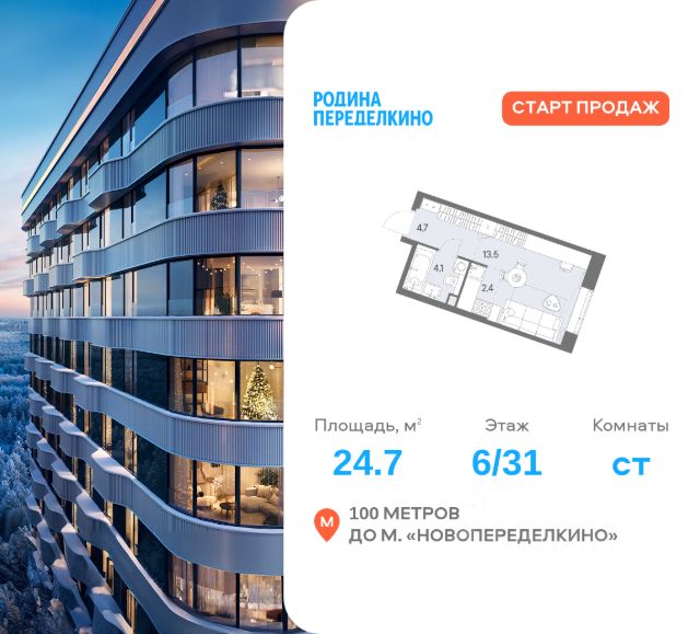 Продаётся студия площадью 25.4 м² на 3 этаже в Жилом Комплексе "Родина Переделкино". Первый в России киберспортивный кластер от Группы Родина. Это жилой квартал бизнес-класса на Западе Москвы на границе с Ульяновским лесопарком, состоящий из пяти высотных зданий с подземной одноуровневой автостоянкой. В жилом комплексе широкий выбор вариантов жилья — от компактных студий до просторных 5-комнатных квартир. Помимо комфортных европланировок, представлены уникальные форматы: квартиры с панорамными гостиными, квартиры с террасами на 2 этаже. Преимущества расположения: • 3 минуты пешком до метро "Новопеределкино" • Лесные массивы - чоботовский лес, ульяновский лесопарк и мещерский природный парк. • Прямой выезд на Боровское Шоссе • 30 минут транспортом до делового центра Москва - Сити • 10 минут на машине до аэропорта "Внуково" Развитая инфраструктура: • 5 жилых корпусов • Деловой центр с Welness и SPA • Мультиарена с развлекательным digital - центром • Гастроулица: кофейни, рестораны, стритфуды