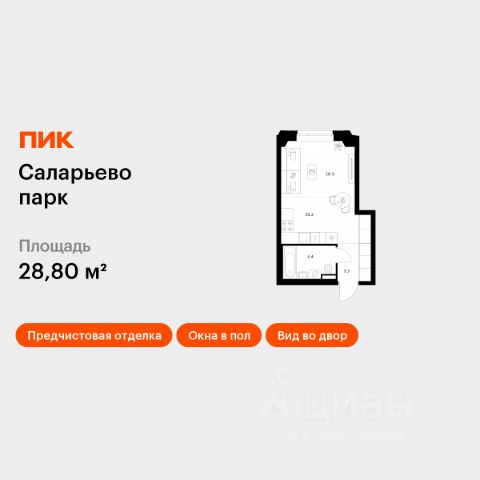 Продаётся квартира-студия площадью 28 кв.м на 5 этаже 24 этажного дома (Корпус 82.8, Секция 8) проекта ПИК Саларьево парк. Светлый просторный подъезд на уровне земли, функциональная планировка, большие окна, c отделкой. Жилой район "Саларьево парк" расположен в Новой Москве, в четырёх километрах от МКАД по Киевскому шоссе. Две станции метро: "Саларьево" и "Филатов луг", — находятся в пешей доступности от проекта. Дойти до них можно за 510 минут. В квартале уже создана качественная среда, где есть абсолютно всё для полноценной жизни, работы и отдыха. Благодаря удобному расположению проекта всё важное будет рядом: детские сады, школы, кафе и рестораны, шопинг в торговых центрах, фитнес и даже аэропорт. Все корпуса в квартале гармонично сочетаются, образуя единую городскую среду. Между собой их объединяет невысокая этажность и натуральная цветовая гамма. Здесь приятно гулять и проводить время на улице всей семьёй. В "Саларьево парке" создана уникальная образовательная среда, включающая в себя шесть школ, рассчитанных на 6 250 учеников. Две из них уже открыты, их посещает 2 300 детей. Также на территории "Саларьево парка" находится 12 детских садов, один из которых с бассейном. Сейчас уже открыты 7 садов. В "Саларьево парке" открыта уникальная игровая площадка — PlayHub "Оригами". Здесь есть ручей, горка-труба и рельефные холмы. Взрослые смогут отдохнуть в уютном кафе, пока дети играют. Также на территории проекта есть SportHub — большая спортивная зона, разделённая по интересам и возрастам. Здесь можно заниматься разными видами спорта: футболом, баскетболом, волейболом и стритболом. Зимой центральную часть площадки превращают в каток. Во дворах-парках жилого квартала есть места для отдыха, детские и спортивные площадки. На первых этажах домов расположены магазины, кафе и полезные сервисы. Также вблизи проекта есть несколько масштабных торговых центров. До ТЦ "Саларис" пять минут пешком, до "Рио", Metro Cash & Carry и "Леруа Мерлен" — пять минут на автомобиле. Артикул 1033180 (Застройщик ООО "Специализированный Застройщик "Тирон") Продается квартира-студия квартир-студий в Саларьево парк в Москве.