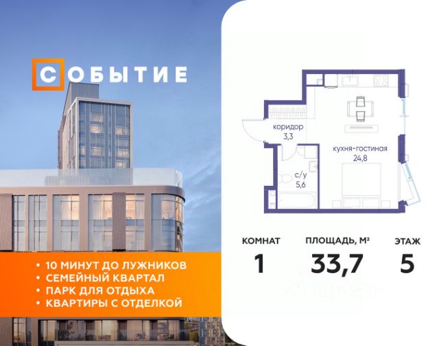 В продаже студия от застройщика. Общая площадь 33.00, жилая 16.50, кухня 8.5. Квартира расположена на 9 этаже жилого квартала "Событие-6", корпус 1, Секция 3. Квартира с чистовой отделкой. Срок сдачи: 4 кв. 2029 года. СОБЫТИЕ.6 — финальный дом парк-квартала СОБЫТИЕ на Мосфильмовской. Переезжайте в уже сформированный квартал с готовой инфраструктурой и парком! Премиальный жилой комплекс в престижном районе Москвы предлагает стильную архитектуру, продуманное благоустройство и великолепно разнообразие общественных пространств. Свой парк прямо возле дома! Архитектура Архитектура СОБЫТИЯ.6 выполнена в ультрасовременном стиле московским бюро Atrium на основе дизайн-кода британских архитекторов LDA Design и UHA London. Дом отличает оригинальная геометрия фасадов, большое остекление и высокие лобби (до 6,2 м) с авторской мебелью и светильниками. Расположение Мосфильмовская улица (Раменки) — один из престижных районов Москвы. Близость к историческому и деловому центру, природным зонам Запада столицы. Транспортная доступность: • 10 мин до Москва-Сити и ТТК; • 15 мин до Садового кольца; • 25 мин до аэропорта Внуково; • 7-10 мин до станций метро "Аминьевская" и "Мичуринский проспект". Инфраструктура: • парк "Событие" (12 га, финалист конкурса Правительства Москвы) с беговыми (1,5 км) и велодорожками (2,7 км), экотропой (1,6 км), площадками, лекторием; • школа, детский сад, магазины, салоны красоты, рестораны (к моменту заселения); • мультидвор с игровыми и спортивными площадками, мини-бульваром; • общественная терраса на 10-м этаже (коворкинг, лаунж); • Закрытые общественные пространства: детская комната, спортивный зал, коворкинг, лаунж-зоны. Паркинг 256 мест для жителей (48 — для электромобилей), 24 гостевых (5 — для электромобилей), мойки колес, кладовые, зоны для велосипедов. Окружение Парки и заповедники (Воробьёвы горы, Матвеевский лес и др.), МГУ, театр им. Н. И. Сац, стадион "Лужники". Безопасность Видеонаблюдение, контроль доступа, видеодомофоны, консьерж-сервис 24/7, системы пожарной безопасности и мультисервисная оптическая сеть.